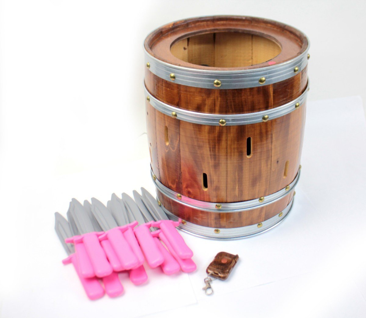 ふうせん樽ゲームが入荷致しました。 中古品の為、傷や汚れ等の使用感が見られます。 付属品の遠隔操作用のリモコンを押し、 針が飛び出し風船が割れるまでの動作を確認しました。 本来の樽ゲームとは違い、リモコンの遠隔操作により、 風船を割る人を選択できるジョークグッズとなっております。 そのため、剣を刺しても風船は割れない仕様となっております。 レンタルでの相場が税込9,900円となっており、 買い切りのお値段としては大変お得になります。 詳しい商品状態につきましては写真にてご確認ください。 この機会に是非ご検討宜しくお願い致します。 【特徴】