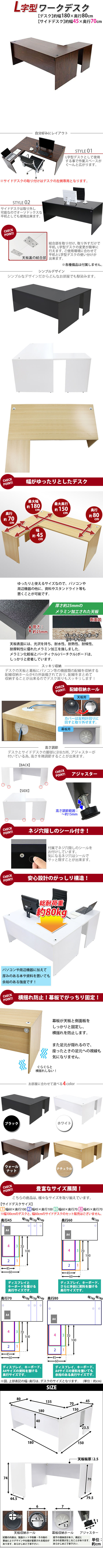 | 商品紹介 | ■作業スペースを広く確保出来る、L字型ワークデスクです。 ■サイドデスクの幅が約45cmのタイプです。 ■会議室や事務所等、オフィス家具として様々なシーンでお使いいただけます。 ■天板には、メラミン加工を施しています。 ■幕板が天板と側面板をがっちりと固定!横揺れを防止します。 ■ネジ穴隠しのシール付き。(サイドデスクのみ付属) ■デスクの天板と幕板に配線収納ホールが2カ所ずつ備わっています。 ■アジャスターで高さの調節が可能です。(高さ調節範囲〜約15mm) ※こちらの商品は、組立て式です。組立てにはプラスドライバーが必要です。お客様でご用意ください。 ※組立図が付属します。 ※サイドデスクの取り付けはデスクの左側専用となります。 ■材質:パーティクル(パーチクル)ボード(メラミン加工)(本体、サイドデスク)、プラスチック(アジャスター、配線収納ホール) ■重量:約60kg(デスク:約47kg、サイドデスク:約13kg) ■総耐荷重:約80kg ●新品商品ではありますが、輸入商品の為、多少の擦り傷などがある場合がございますので、ご納得の上ご購入下さいませ。 ●ご購入後、お客様ご都合によるご返品、ご返金等は一切お受け致しておりません。 ●本商品を使用した際に発生したトラブル、事故につきまして、当社は一切の責任を負いません。ご使用に関しましては、全て自己責任にてお願い致します。 ※カラーはウォールナットとなります。 |