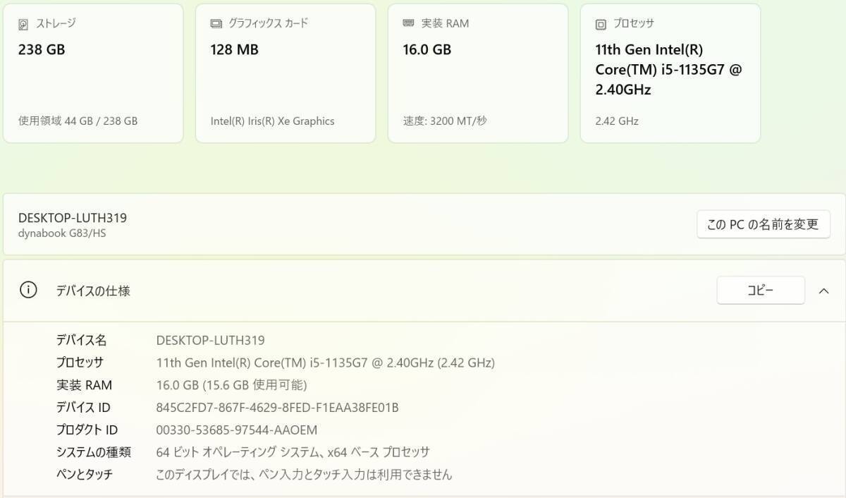 【良品】dynabook G83/HS i5-1135G7 @2.40GHz 11世代 メモリ 16GB SSD 256GB 13.3型 Windows11 Pro office2024