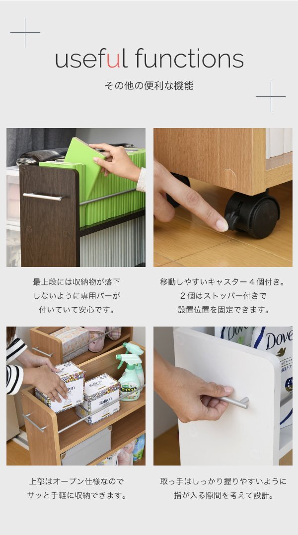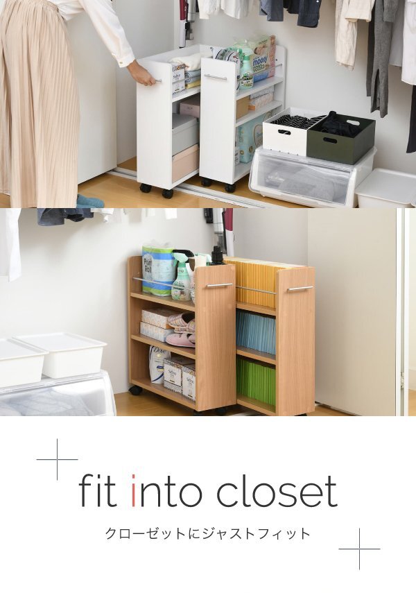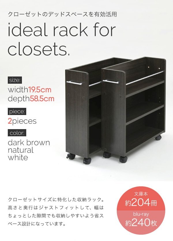 ※現在ご覧の商品ページはダークブラウンのご購入ページとなります。 ヤフオクの仕様上単一ページに複数バリエーションを掲載することができませんので、他バリエーションが希望の場合は別ページでご購入お願い致します。 クローゼットにぴったり入る、キャスター付きラック2個組。 クローゼット内のスペースを有効活用して、本やメディア、日用品を収納できます! ※撮影時の小物は付属しません。 配達業者を指定いただくことはできません。 沖縄・離島への配送は別途配送料が必要です。 ※別途送料が発生する場合は後ほどご連絡させていただきます。 タイミングによっては在庫切れの場合があります。