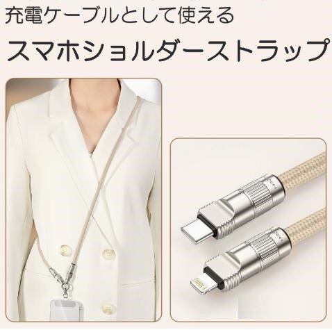 スマホショルダーストラップ ベージュ 120cm 充電ケーブル 2in1 TypeC + Lightning 充電コード 斜めがけ 肩掛け