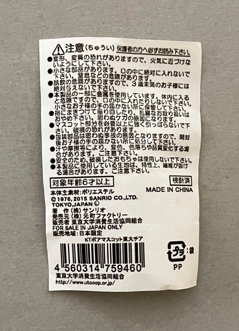 ハローキティの東京大学オリジナルマスコットです。未使用品ですが経年劣化により靴にひび割れがあります。画像にてご確認をお願いいたします。
