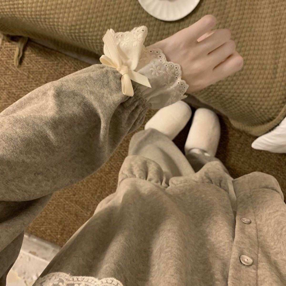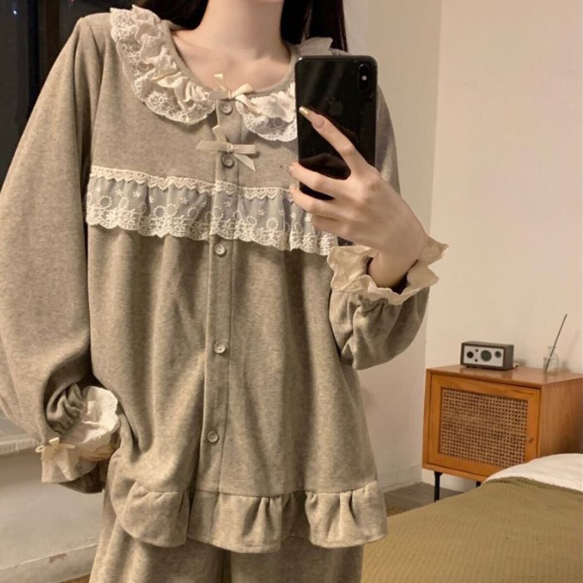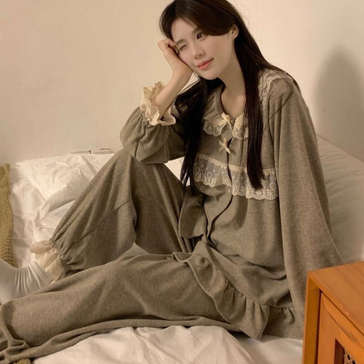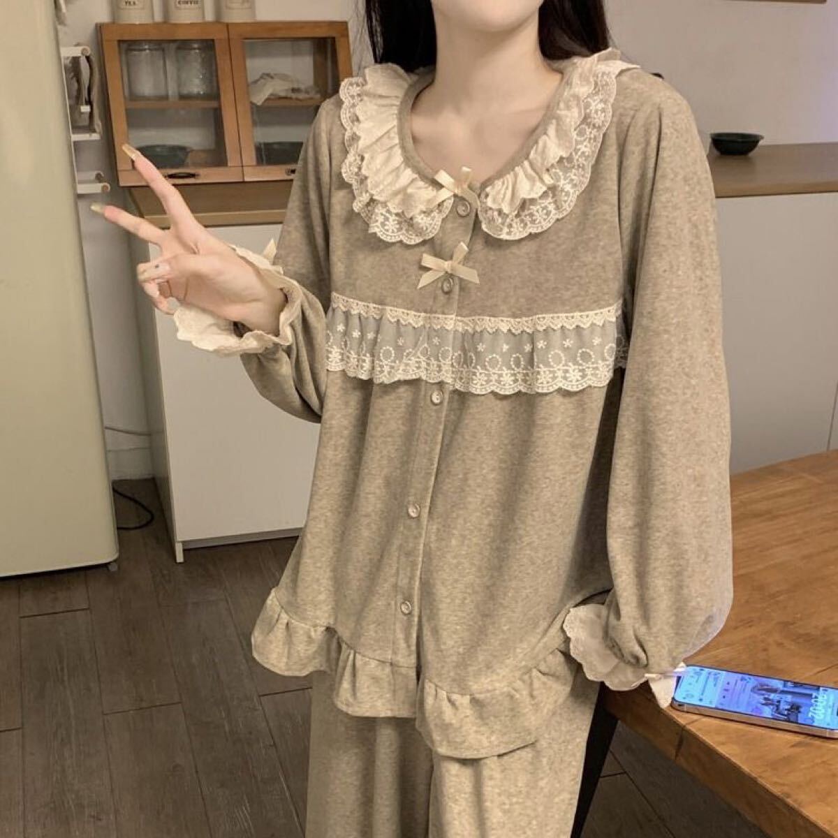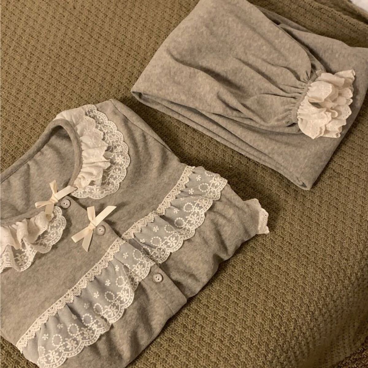 ルームウェア レディース 上下セット セットアップ レース パジャマ 部屋着 春秋 長袖 前開け パンツ オーバーサイズ 体型カバー ワイドパンツ 大人 かわいい SLSD020(M-2XL)