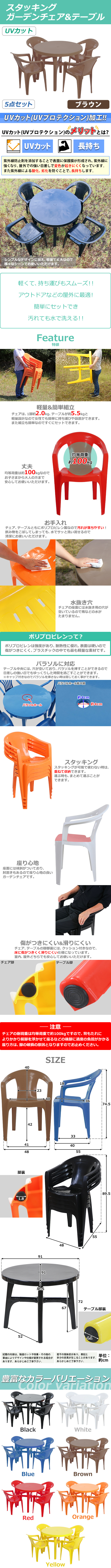 ●UVカット加工によって屋外での強い日差しで変色しにくくなっています。 ●紫外線による酸化、劣化を防ぐことにより、長持ちする作りになっています。 ●ガーデンチェアは、スタッキング構造なので重ねる事が可能なので、収納やまとめて運ぶ際にも大変便利です。 ●テーブル中央にパラソルなど、設置可能な穴があります。 ●テーブルは、簡単な組み立て式になります。チェアは、完成品です。 ●チェアは1脚約2kg、テーブルは約5.5kgと軽量なので、女性でも軽々持ち運べます。 ●材質は、軽量、安全、防水のポリプロピレン(PP)です。 注意! 背もたれによりかかり前脚を浮かせて座るなどの後脚に過度の負担がかかる座り方は脚の破損の原因となりますのでお止めください。 ■重量(チェア):約2kg(1脚あたり) ■耐荷重(チェア):約100kg(1脚あたり) ■重量(テーブル):約5.5kg ■耐荷重(テーブル):約100kg ■材質:PP[ポリプロピレン](チェア、テーブル)、ゴム(チェア脚裏)、PVC(テーブル脚裏) ●商品のカラーはブラウンとなります。 ●新品商品ではありますが、輸入商品の為、多少の擦り傷などがある場合がございますので、ご納得の上ご購入下さいませ。 ●ご購入後、お客様ご都合によるご返品、ご返金等は一切お受け致しておりません。 ●本商品を使用した際に発生したトラブル、事故につきまして、当社は一切の責任を負いません。ご使用に関しましては、全て自己責任にてお願い致します。 |