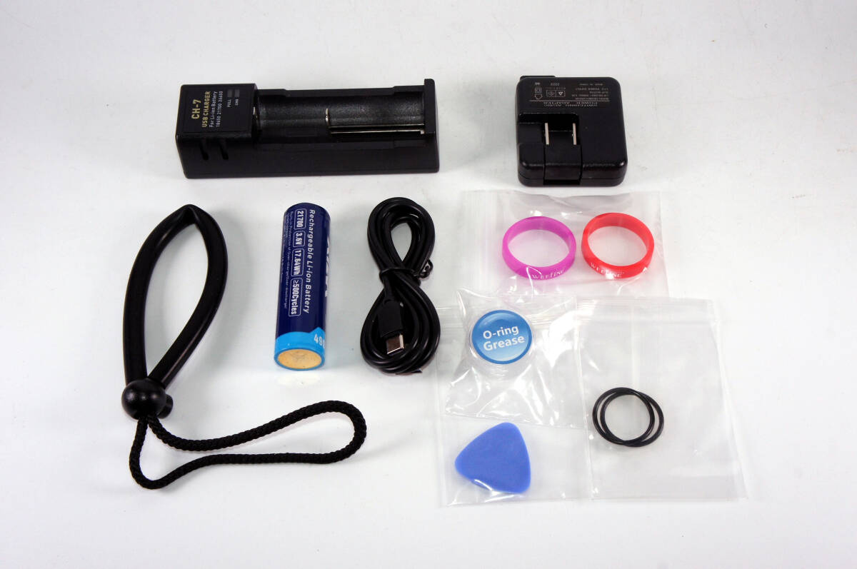 バテリー、充電器、ACアダプター、USBケーブル、ライトヘッドカラーバンド、スペアOリング、Oリングリムーバー、グリス