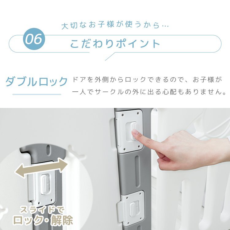 | お子様に安全な軽くて柔らかい素材と丸みを帯びたデザイン! ママにも簡単に組み立てられるベビーサークルです。 赤ちゃんの脳の発達を助けるトイパネルも付いています。 工具不要で組み立て簡単! お好みの形に広げて接続部分のキャップを締めて固定するだけ! 最大スペース約133cm×133cmで広々と遊べます。 外側から扉をロックすることができるので お子様が勝手に外へ出てしまう危険性がありません。 お手入れはサッと拭くだけ! 組み立てたまま拭けるのでお手入れも簡単! いつでも清潔を保てます。 【商品仕様】 内容:パネル ×10 (おもちゃパネル×1、扉パネル×1、パネル×8) サイズ:最大スペース(約)133cm×133cm×高さ60cm 素材ポリエチレン 【カラー】 ・パステルカラー |