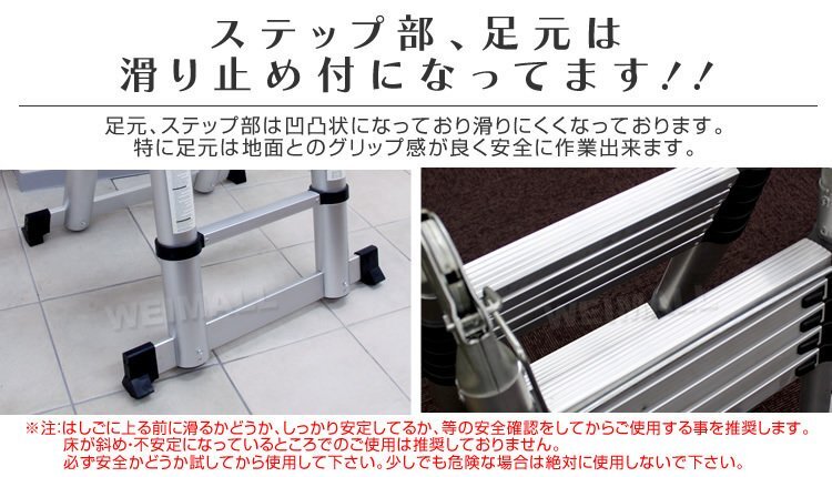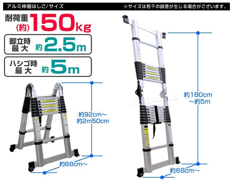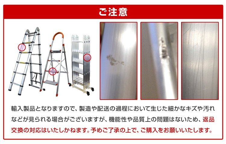 伸縮自在で使用時には1段ずつの引き伸ばし可能! 必要な高さでロックできます。 車のトランクに収納可能。どこにでも運べるコンパクトサイズ! 折りたたんでもたったの17cm!収納スペースにも困らない! さらにアルミ製のパイプとダブルロックの設計で頑丈、安全! 足元の安全性パワーアップし、今まで以上に安心して作業できます! 私生活に不可欠なはしごです! 電球交換やエアコン掃除、2階~3階の外壁、洗車など様々な場面にて活躍! 【商品仕様】 最長:500cm(脚立時:250cm) 収納時:92×68cm 質量:18kg 最大耐荷重:150kg 素材:アルミ(連結部分:スチール) 【注意事項】 ・商品の重量が重く、ケガを防止するためにも、2人以上での作業をされますようお願い致します。 ・ロック状態を確認した上でのご使用をお願い致します。 ・天板部分に乗ってのご使用は危険な為、お止め下さい。 ・足元が不安定な場所などでのご使用はお止め下さい。 ・海外からの輸入製品となりますので、製造、または配送の過程において生じた、細かなキズやへこみが見られる場合がございますが、機能性や品質上に問題はないため、返品や交換の対象とはなりません。予めご了承の上、ご購入をお願いいたします。 ・商品を使用して発生した事故・トラブル・破損等につきましては一切の責任を負いかねます。 ・商品は、モニターによって色合いが異なって見える場合があります。 ・仕様・デザインは改良のため予告なく変更することがあります。 |