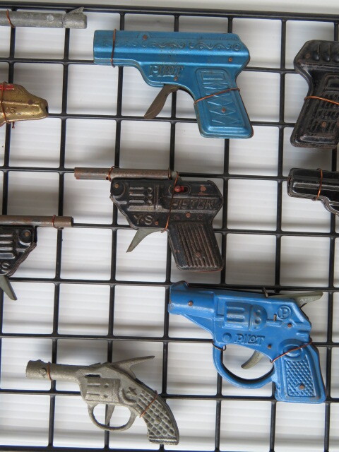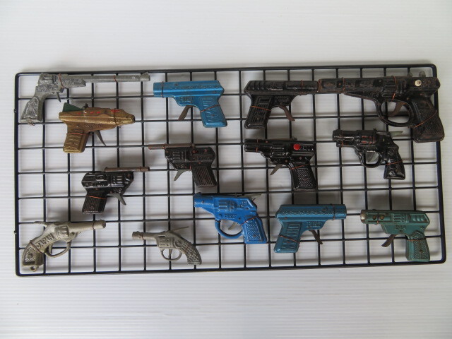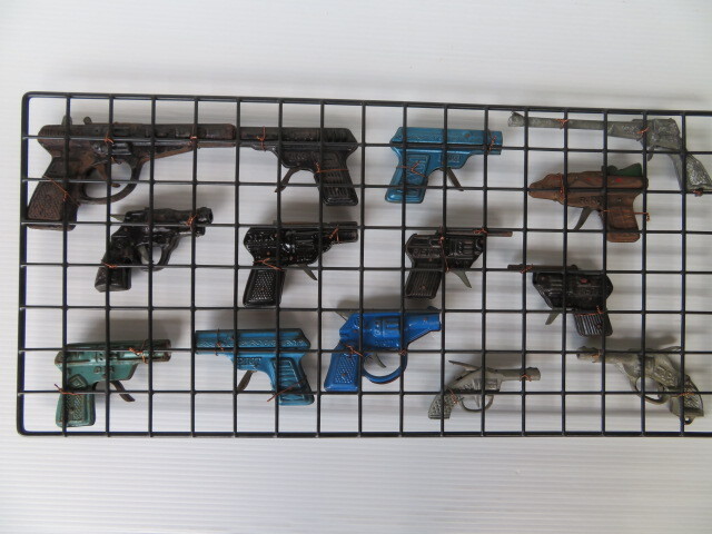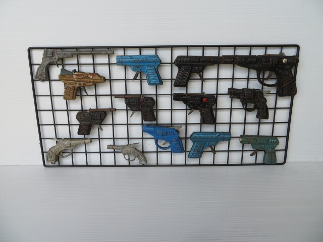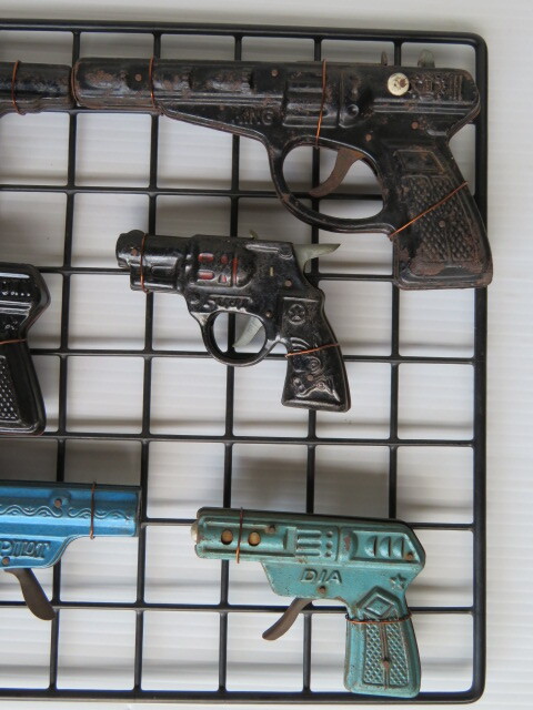 昭和レトロ感のあるブリキのピストルで、格子状の枠に取り付け、飾って鑑賞していた品物です。