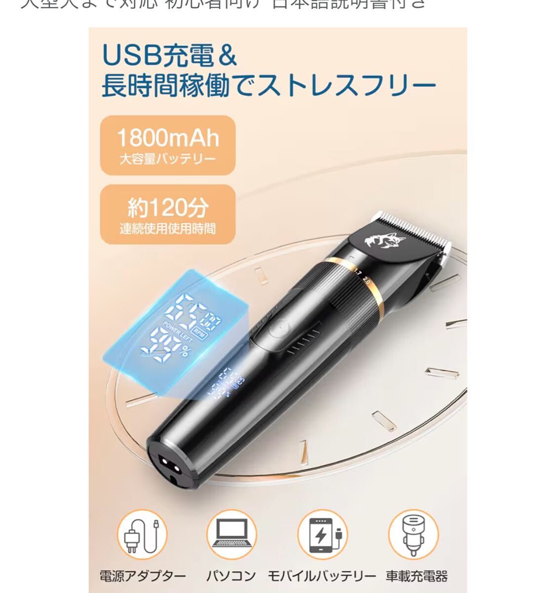 【コードレス・USB充電で快適使用】1800mAhの大容量バッテリーを内蔵し、最大約120分の連続使用が可能。USB充電式で、どこでも簡単に充電でき、時間に縛られずに使えるので、外出先でも便利です。わずか数時間の充電で長時間使用でき、コードレス&軽量設で持ち運びも簡単。LEDディスプレイで電池残量や速度を一目で確認でき、いつでも安心して使用できるペット用バリカンです。
