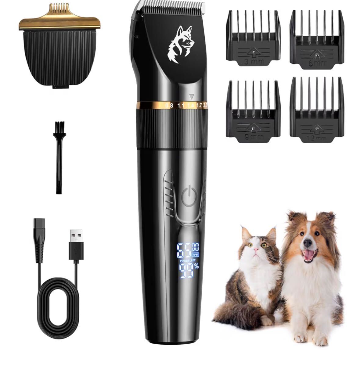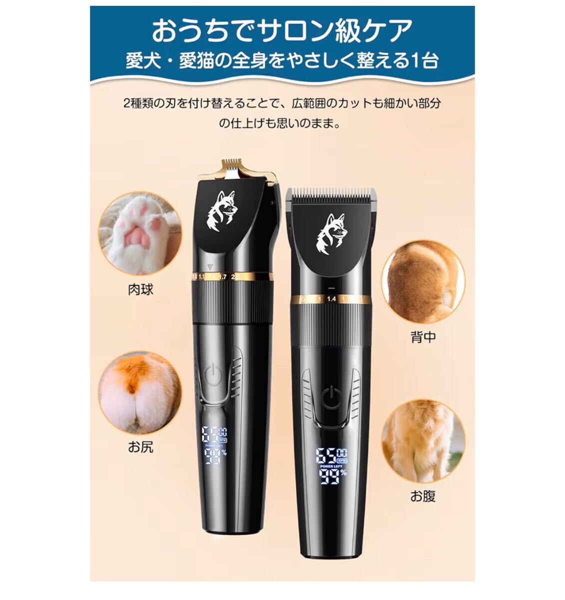 ペット用バリカン 犬用 バリカン 猫用 静音 低振動 電動バリカンセット 2種類刃付き 2段階スピード調整 5段階刈り高さ 4種類ガイドコーム付き コードレス USB充電式 1800mAh大容量バッテリー IPX7防水 LEDディスプレイ 足裏 顔 背中 お腹 全身カット 自宅トリミング 小型犬から大型犬まで対応 初心者向け 日本語説明書付き