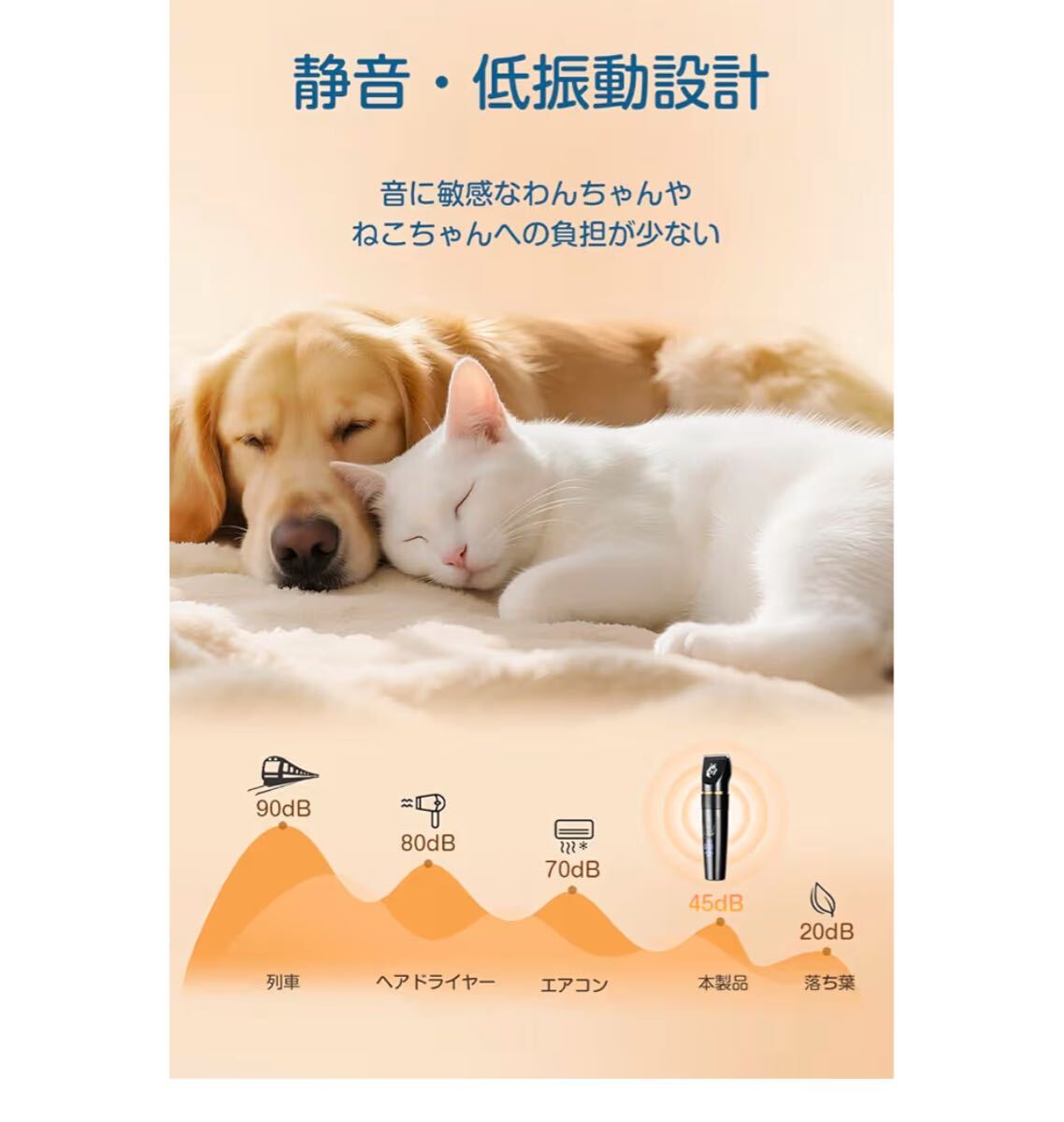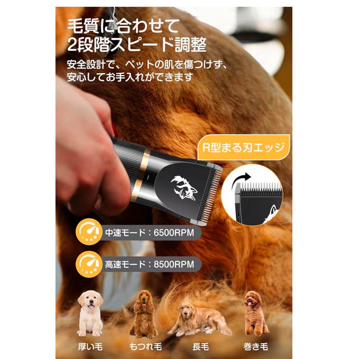 【静音設計&R型安全刃設計でペットにやさしい】45dBという静音設計により、トリミング中の騒音を最小限に抑え、音に敏感な犬や猫にも安心。静かな動作音で、怖がりなわんちゃんやねこちゃんもリラックスしてお手入れができ、動物たちにストレスを与えることなく、安心してケアができます。さらに、R型の丸みを帯びた刃先がペットの皮膚をやさしく守り、肌を傷つける心配もありません。安全に使用できるペット用バリカンです。