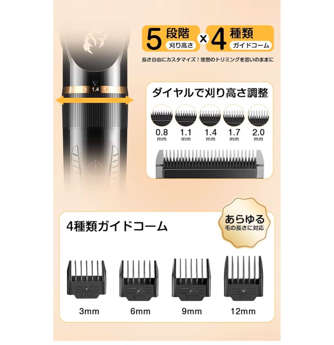 【5段階高さ調整+4種類ガイドコームで理想のスタイルに】ペット用バリカン本体の5段階刈り高さ調整と4種類のアタッチメントを自由に組み合わせることで、思い通りの長さ・スタイルに仕上げることができます。チタン合金+セラミックのダブル刃を採用し、切れ味が鋭く、スムーズで快適なカットが可能。初心者からプロのトリマーまで使いやすい高性能ペット用バリカンです。