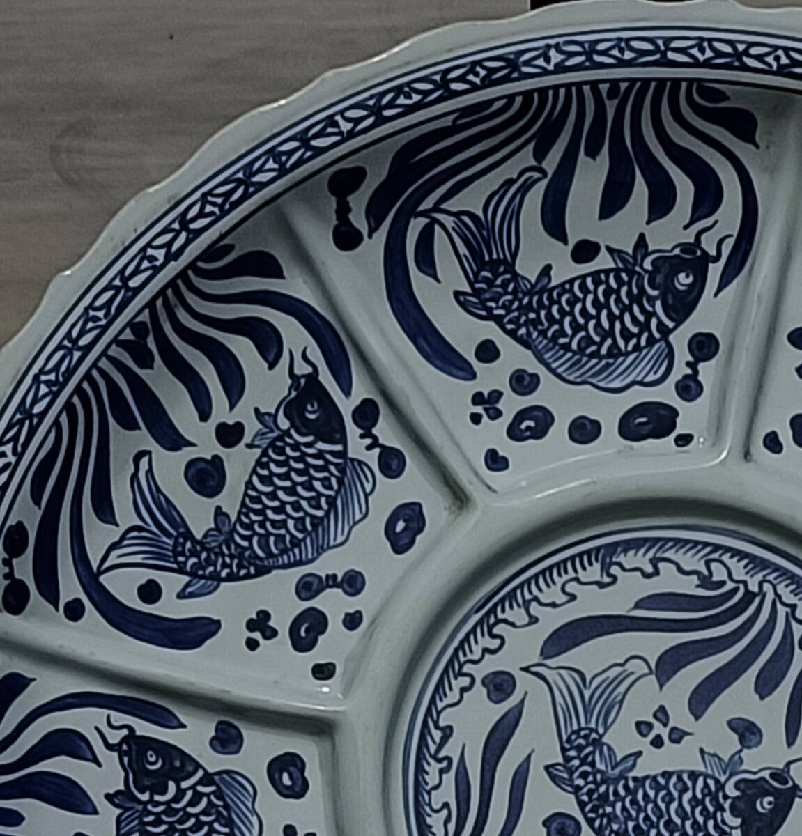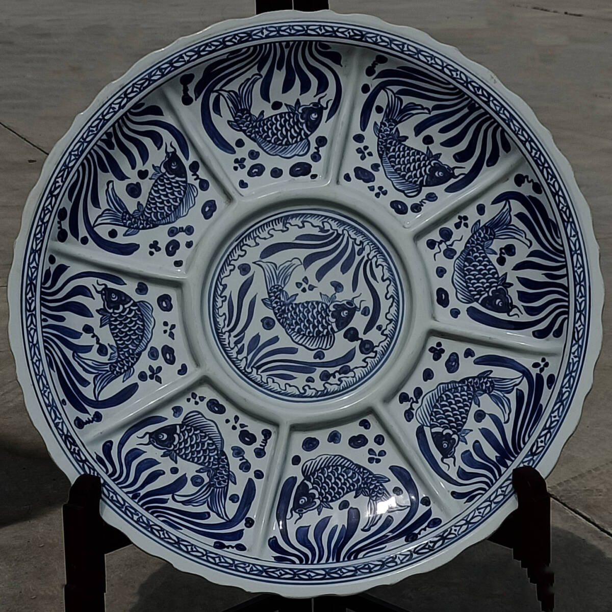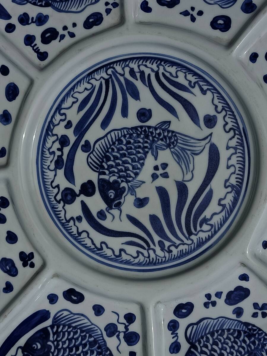 B_YF2812【惠】人間国宝 中国骨董 陶芸 磁器【旧蔵老魚皿です】工芸品 施釉陶 青花磁 陶芸 置物 收藏品