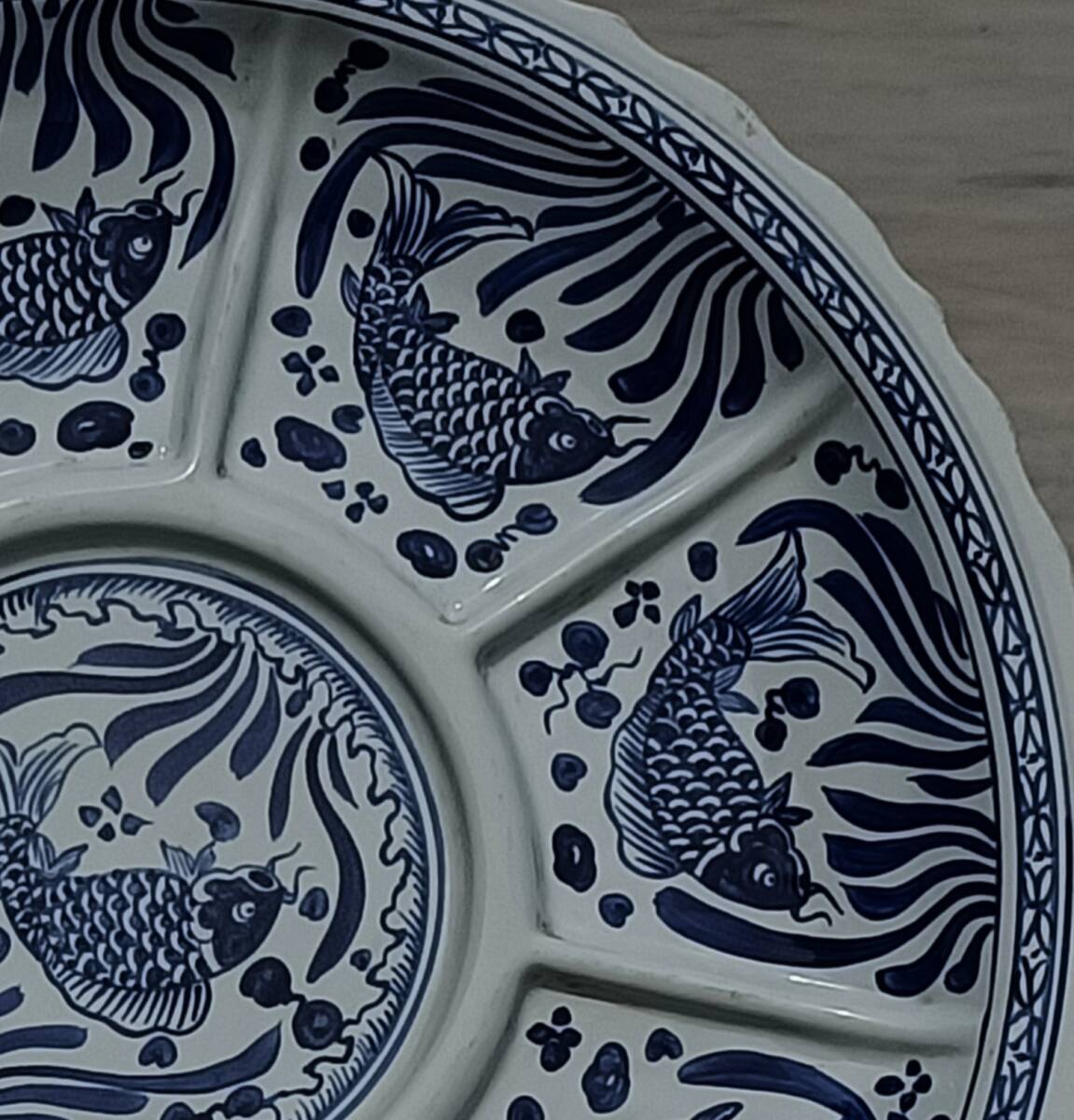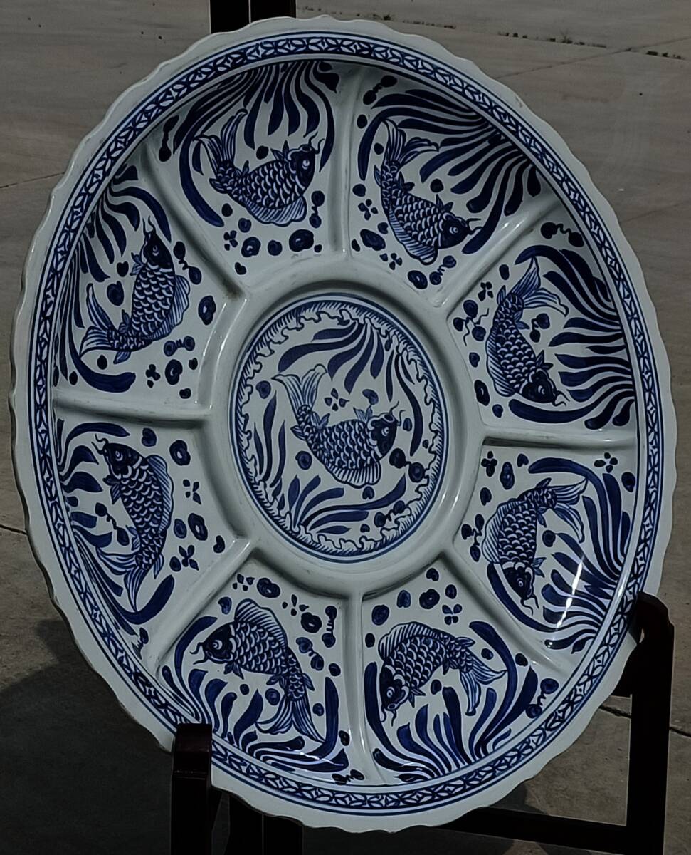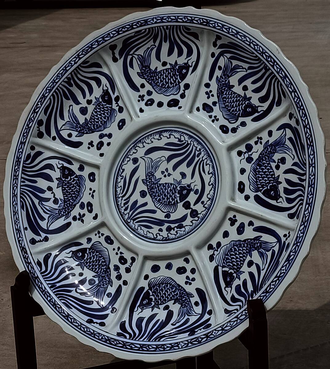 B_YF2812【惠】人間国宝 中国骨董 陶芸 磁器【旧蔵老魚皿です】工芸品 施釉陶 青花磁 陶芸 置物 收藏品