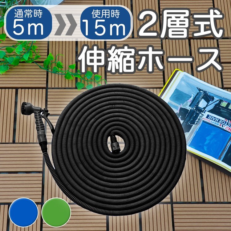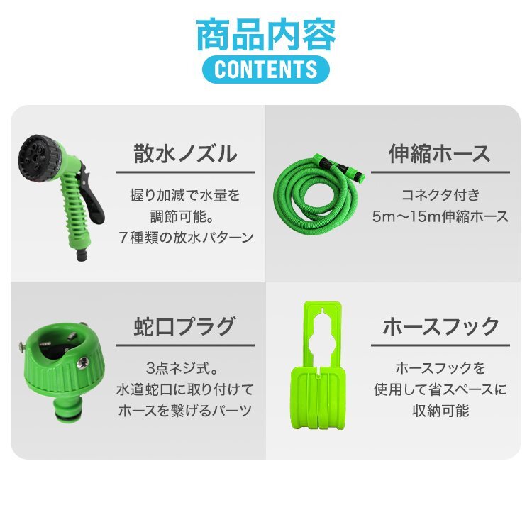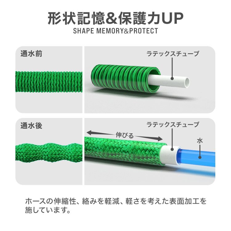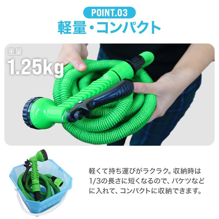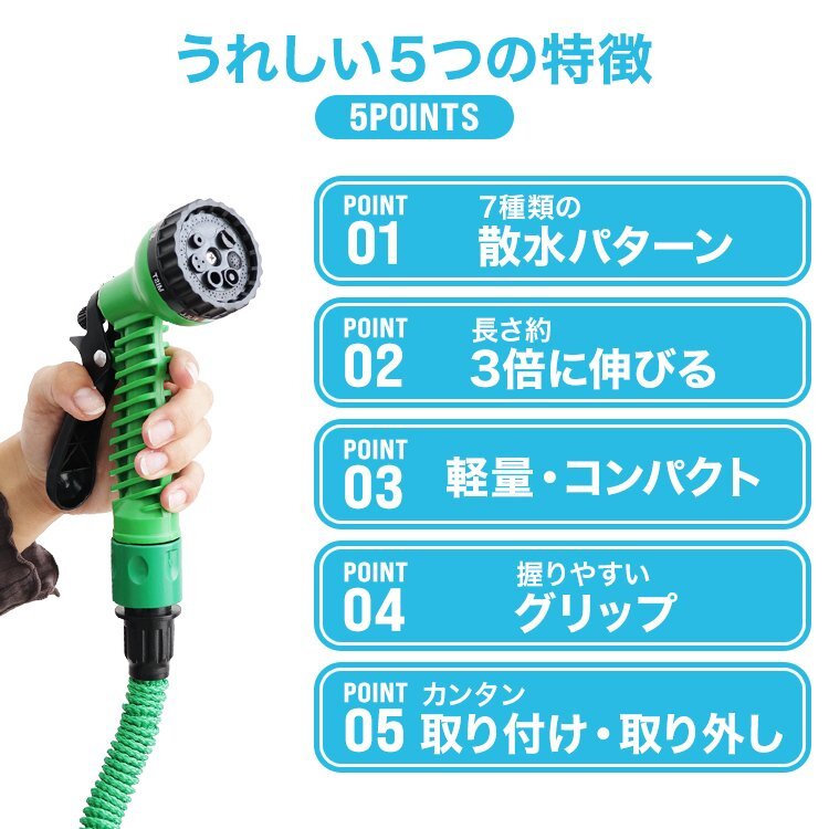 水を通すと水圧で3倍に伸びる伸縮ホース! たった5メートルのコンパクトなホースが使用時には3倍の15メートル! 水道の圧力がホースを伸ばしているので、使用後は元のサイズにもどり、コンパクトに収納! 7種類の散水パターンに変更できるシャワーヘッドを標準添付。細かな部分から広範囲まで、用途に応じた散水パターンが選べます!