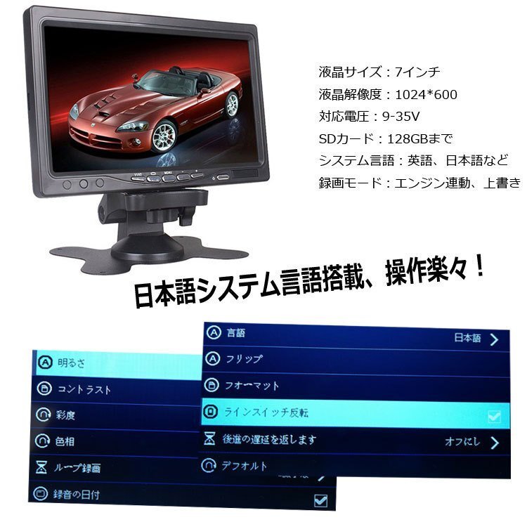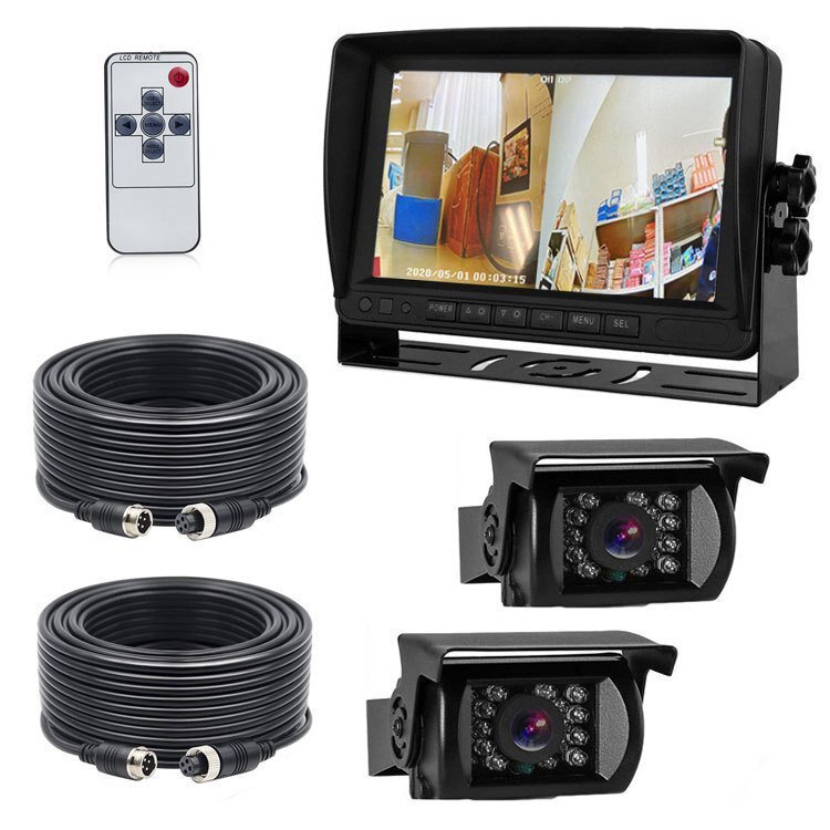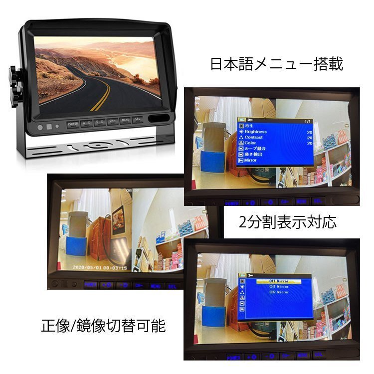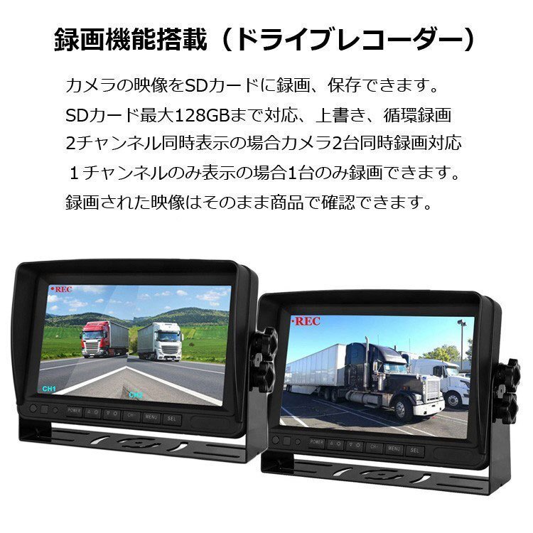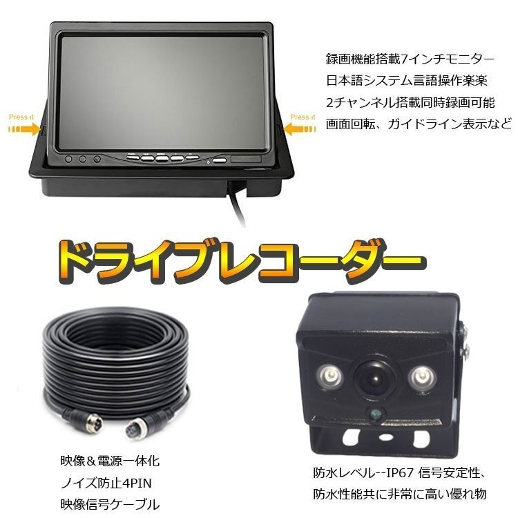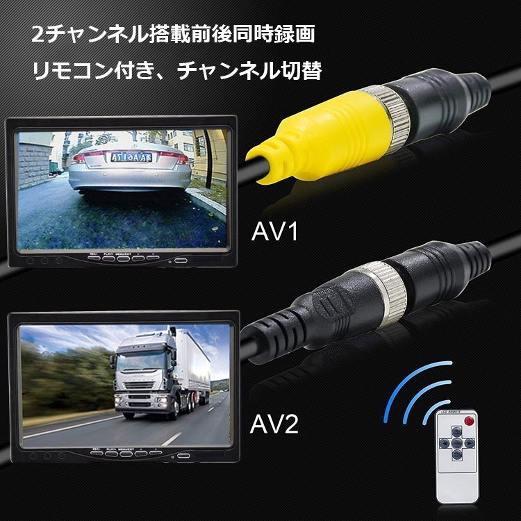 ◆AHDデジタルバックカメラ2個搭載 車載レコーダー 12/24V車兼用 トラック 重機 バスのドラレコに CH1またCH2リアルタイプ録画可能 20M映像ケーブル2本付き エンジン連動 上書き 危険運転対策 リモコン付き メモリカード録画 7インチDVRモニター 2分割対応 OMT70AHDSET2