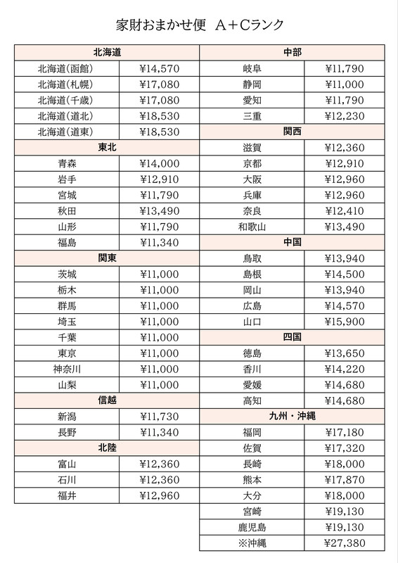 配送方法は「家財おまかせ便」もしくは「直接引取」となります。 1.「家財おまかせ便」 送料は落札者様のご負担とさせて頂きます。 送料は地域別で異なります。下の表にてご確認をお願いいたします。