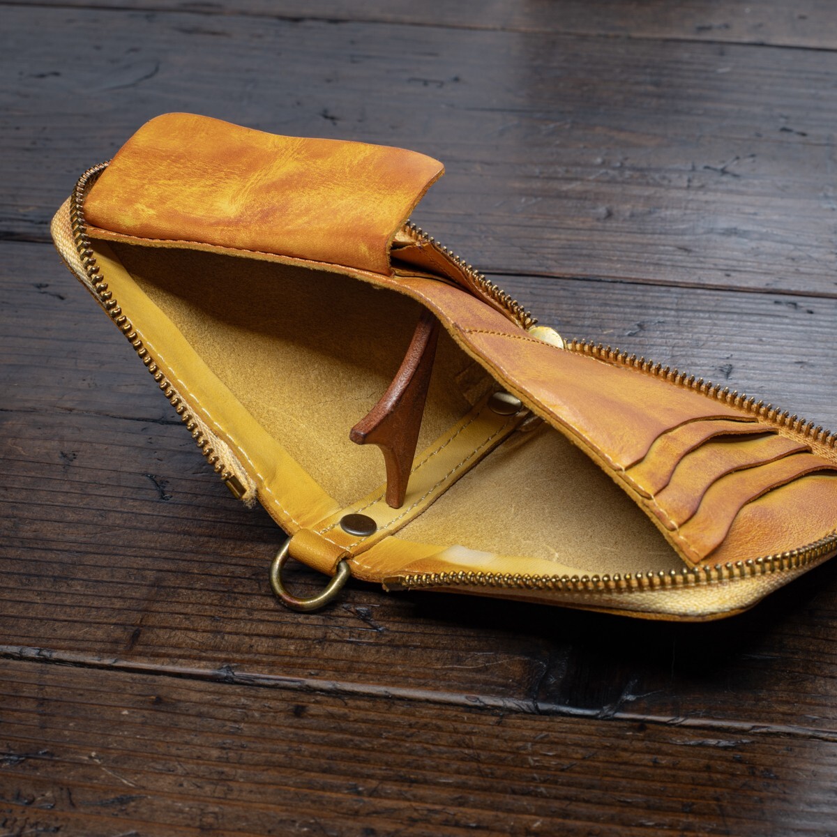 内装にも同じ革を使い、布などの裏地はあえて省いています。そのぶんかさばらず、丈夫でスリムな仕上がりです。収納は最低限にとどめたシンプルな構造で、余計なポケット類はありません。質実剛健な作りを好む方に向いています。