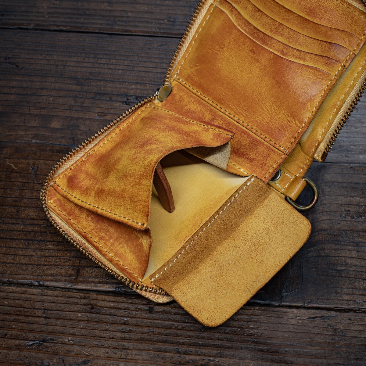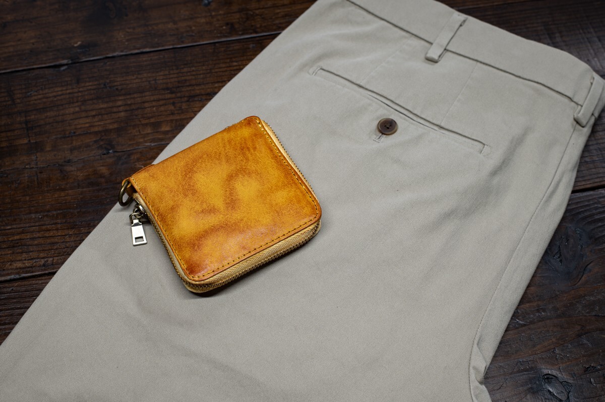 ウォッシュドレザーを使ったラウンドファスナーです。見た目に反して革質は柔らかく、サイズもコンパクトなので、ズボンの後ろポケットにすっぽり収まり、気軽に持ち歩けます。