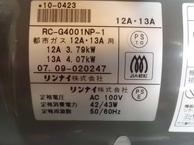 リンナイ型番 : RC-G4001NP-1    東邦ガスOEM品番 : RC-41FAT-P(R)