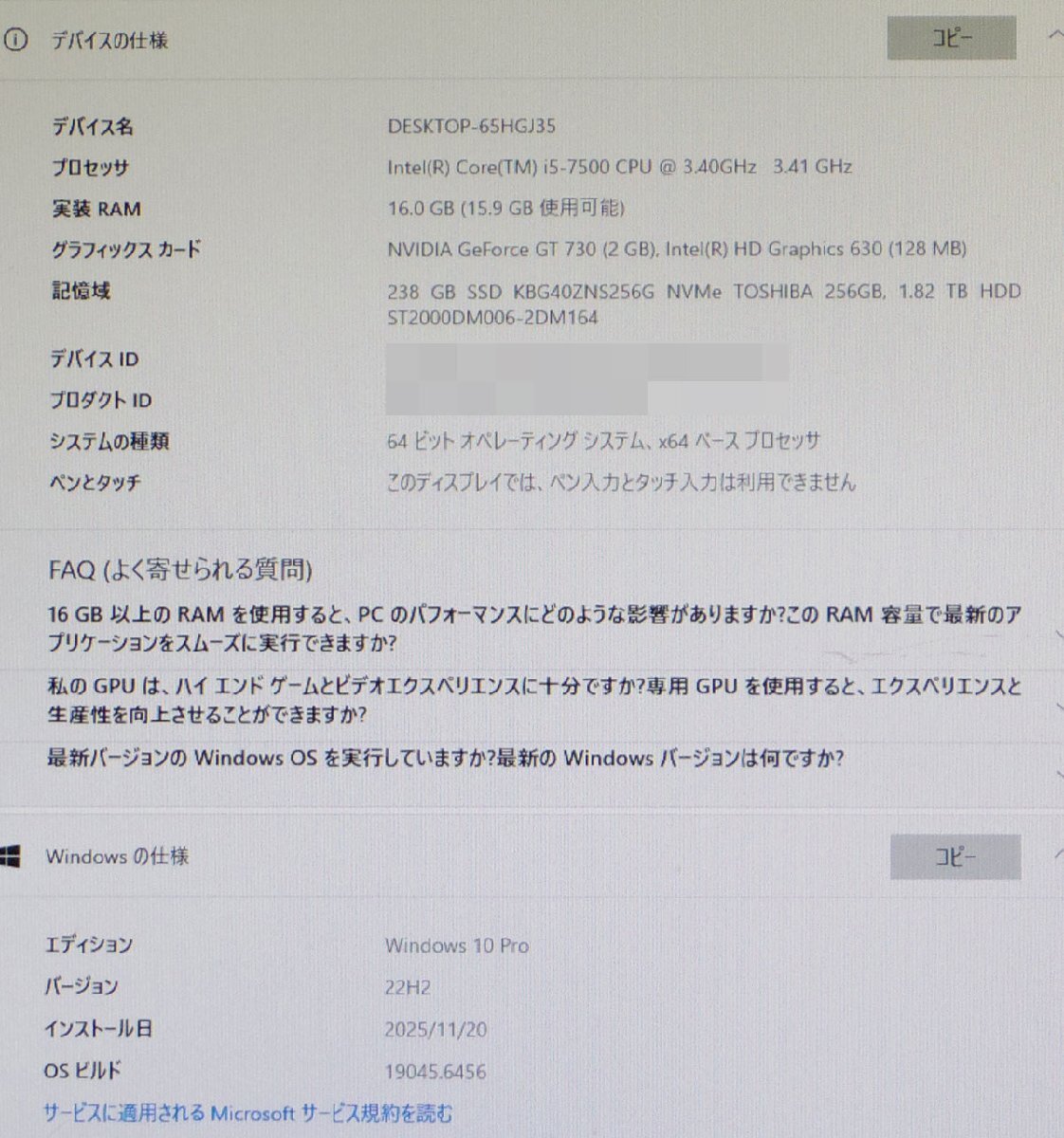 | その他 | Core i5(第7世代)搭載。 総メモリ16GB、SSD256GB,HDD2TBのスリムタワーPC グラフィックボード:GeForce GT730 USBポートチェック:OK Windows 10のクリーンインストール済み、 ドライバ全て当たっています。 リカバリディスク等はありません。 使用に伴う多少のキズ、スレ、汚れ等あります。 こちらは商品到着後、7日間の初期不良対応です。 |