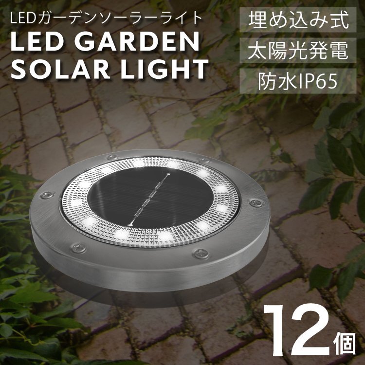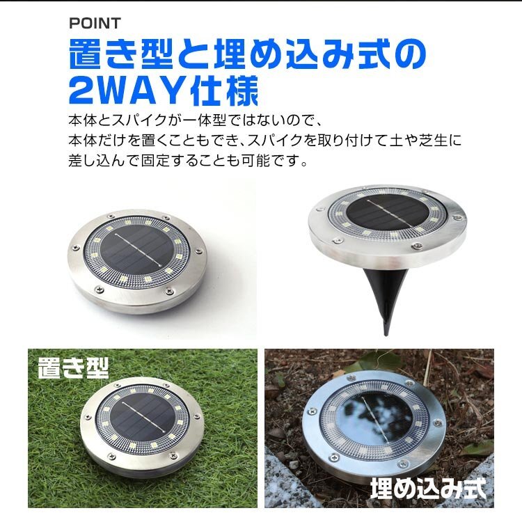 地面に埋め込むだけで設置でき、ソーラー発電で電気代不要! お庭や玄関先などに最適なLEDソーラーライトです。 地面に置くor埋め込みだけでセッティングもカンタン。 光センサー内蔵で暗くなったら自動点灯、明るくなったら自動消灯。不要時は点灯をオフにできます。 玄関までの通路や庭先までのアプローチ部分にやさしい明かりを灯して下さい。 防水仕様で屋外設置・ガーデニング照明にも最適! 【商品仕様】 サイズ ・直径:(約)11.5cm ・ソーラーライト本体:(約)40cm ・全長:(約)2.5cm/スパイク使用時12.5cm 重量:(約)本体/100g+付属品/121g 発光色:昼光色 光源:LED 内蔵バッテリー:リチウム電池 600mAh 点灯時間:(約)最大6~8時間 ※直射日光が6時間以上あたる場所に設置した場合。 防水:IP65 素材:ステンレススチール+PP+ポリスチレンレンズ 【商品内容】 ・本体 ×12 ・スパイク ×12 |