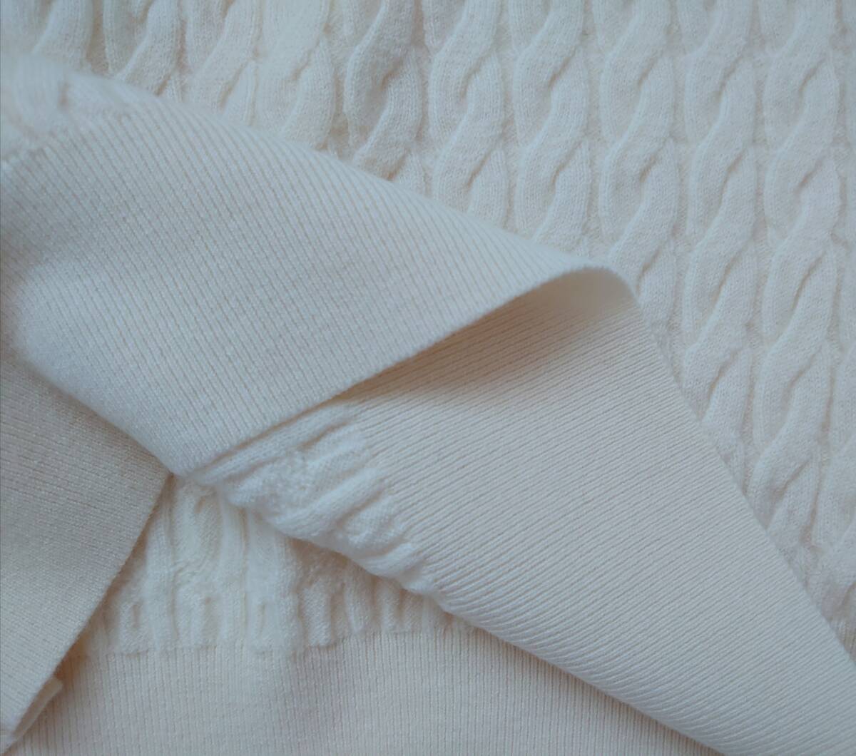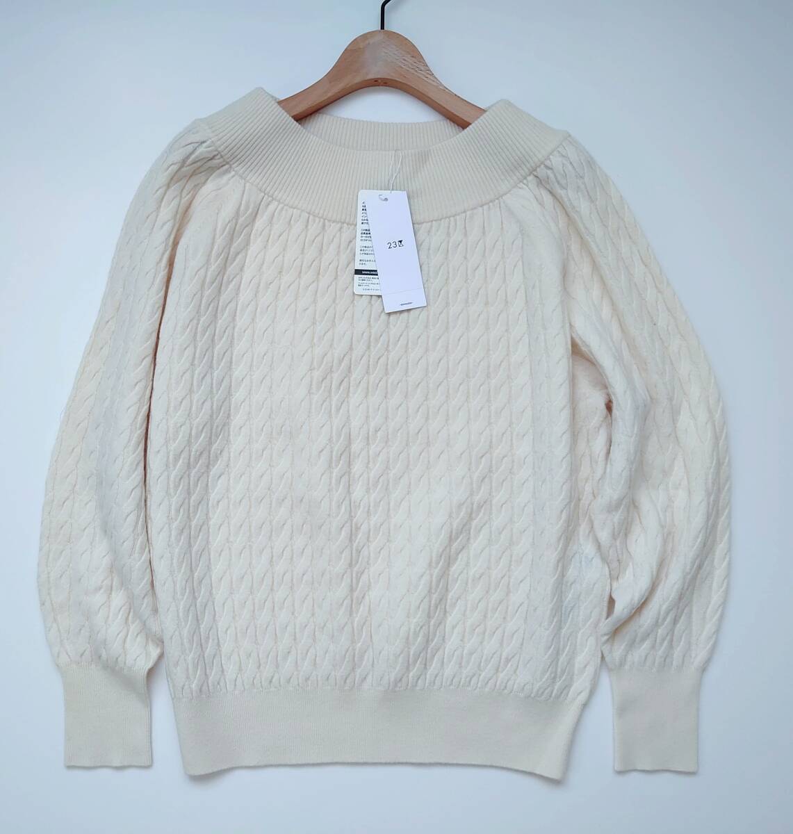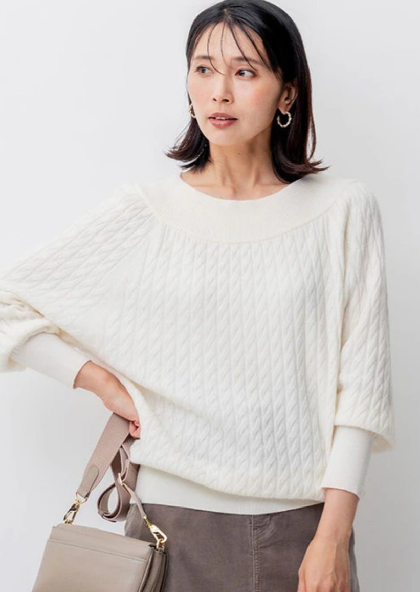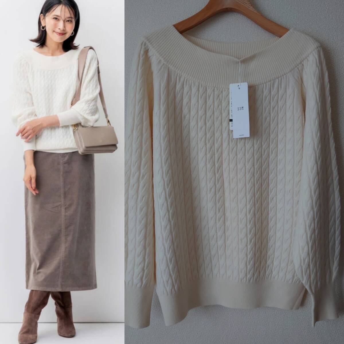 幅の太いリブがポイントのボートネックと、立体感のある編み柄で、