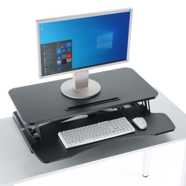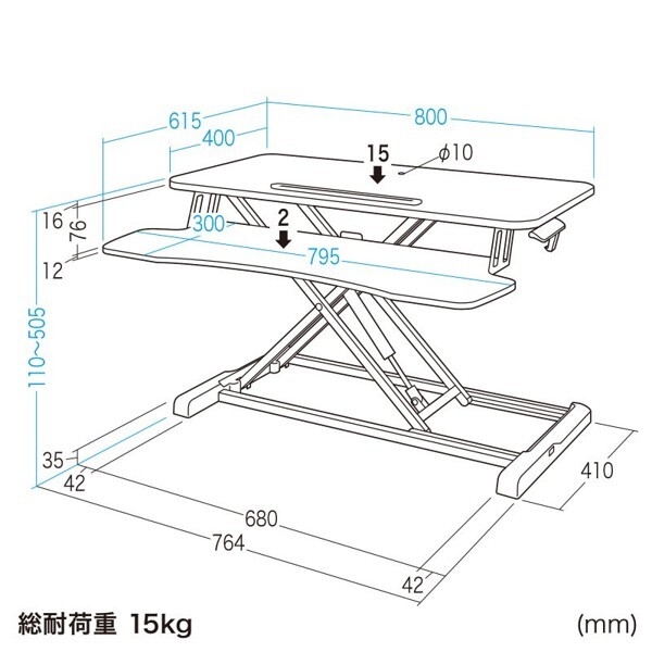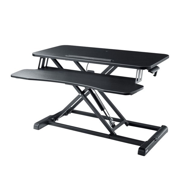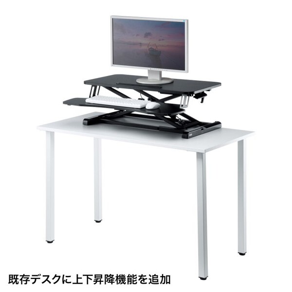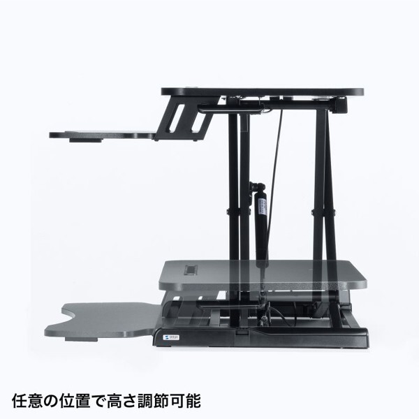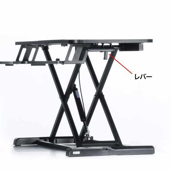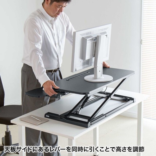 ※メーカー直送です。沖縄・離島配送不可となります。 当店は正規販売代理店です。 特長 デスクに置くだけで、上下昇降機能を追加することができます。 任意の位置で高さ調節可能です。 ※物を降ろしてから上げてください。 ※物を降ろしてから下げてください。 ※水平で安定した場所で操作してください。 天板サイドにあるレバーを同時に引くことで高さを調節することができます(110~505mm・無段階)。 ガスシリンダーが内蔵されており、天板上に機器が載っていても急激に落下しません。 1日の中で立ち作業、座り作業の時間を作ることで疲労を軽減できます。 座り作業の際にはキーボード台は天板の高さまで下がります。 天板前部にはスマートフォンやタブレットを立て掛けることができるスリットがあります。 乱雑になりがちなケーブルを固定でき、スッキリ処理できるケーブルクリップ付きです。 タイミングによってはメーカー様在庫切れの場合があります。