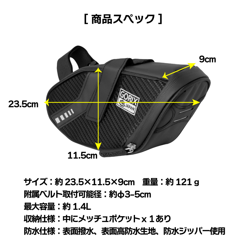 商品内容サドルバッグ サイズ約23.5×11.5×9cm 重量約121 g 附属ベルト取付可能径約φ3-5cm 最大容量約1.4L 自転車に取付位置サドル 収納仕様中にメッチュポケットx1あり 防水仕様表面撥水、表面高防水生地、防水ジッパー使用 ※商品のカラーはディスプレイ種類環境等により実物と異なって見える場合がございます。 《ご注意》 ・商品は入荷によりキズがある場合があります。 保証対象外になりますのでご了承お願い致します。 ・ディスプレイ環境により実物と色が異なる場合が有ります。 ・入荷時期により予告無く一部仕様変更する場合が有ります。 | |