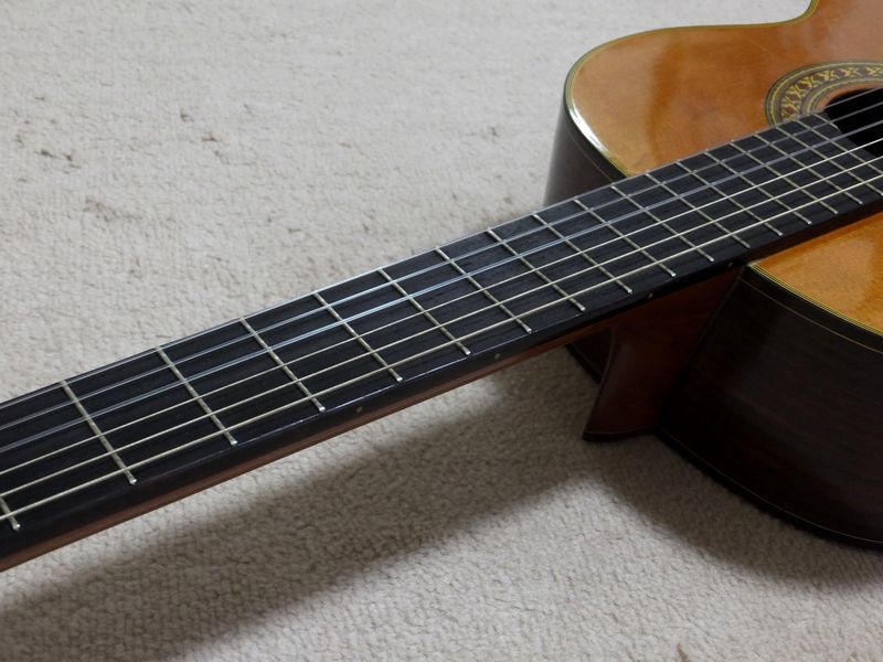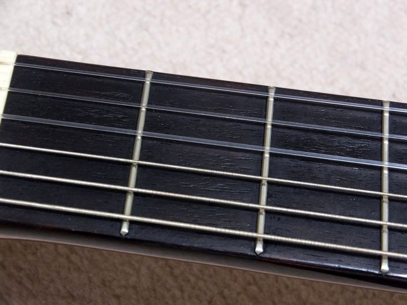 指板のローフレットは写真に撮りました。凹みというほどではありません。