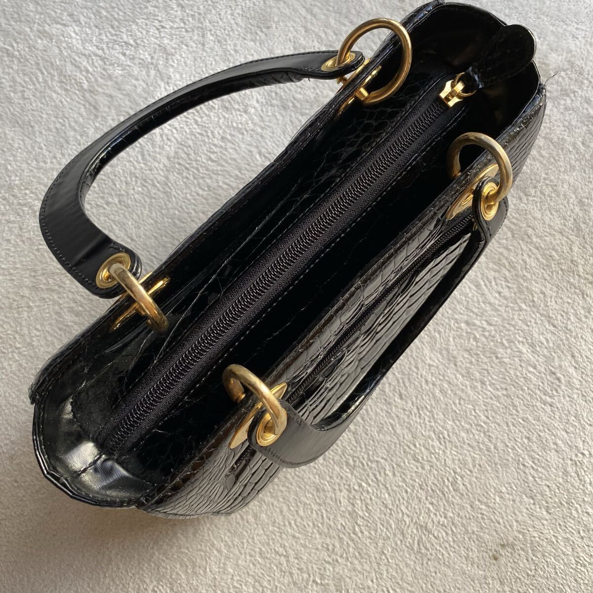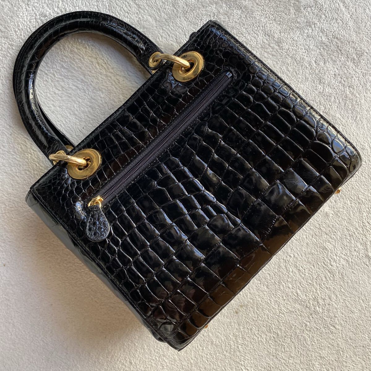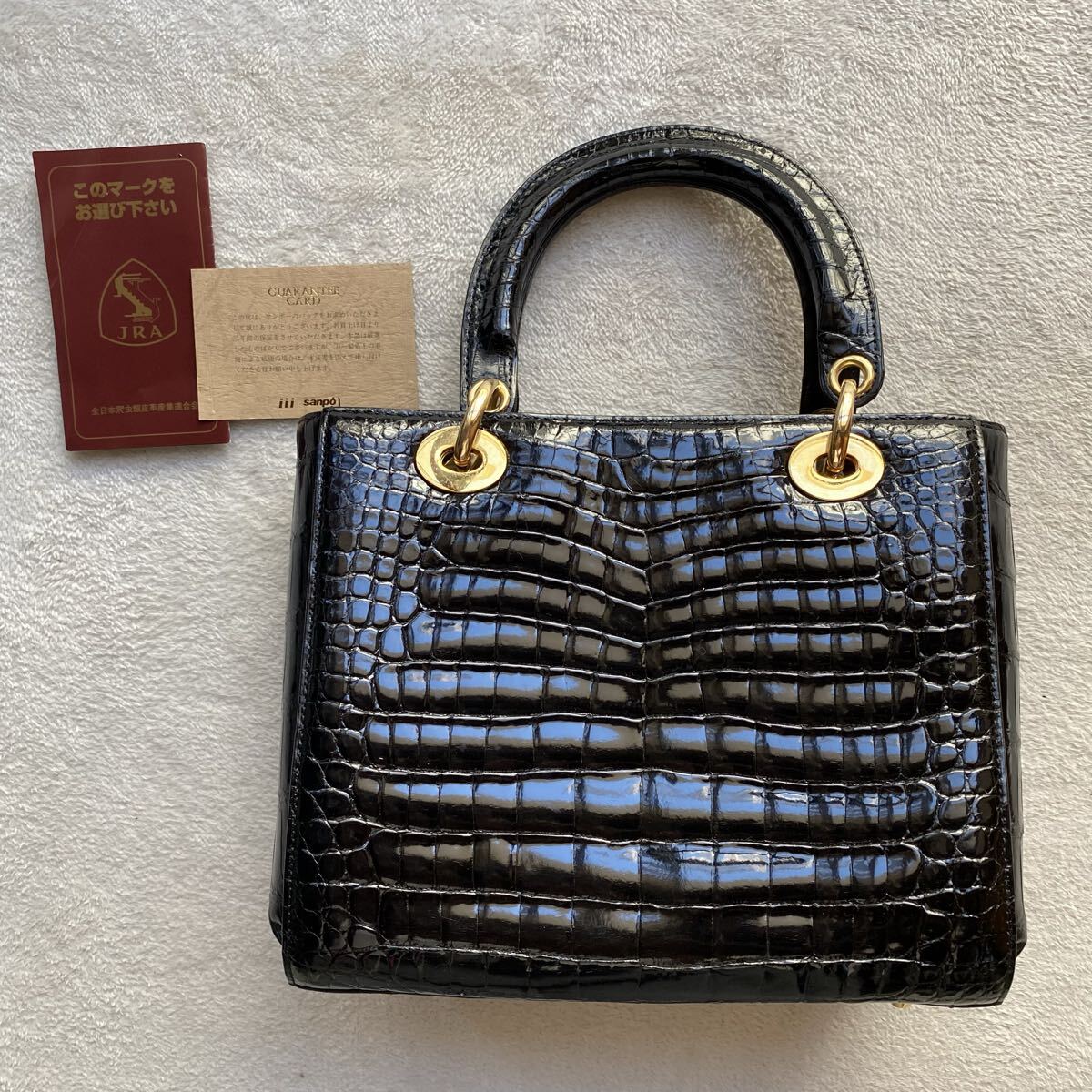3点送料無料☆ 美品 艶感SANPO クロコダイル ワニ革 黒 ハンドバッグ 証明書 ギャランティー シャイニングクロコ  ゴールド金具JRA認定
