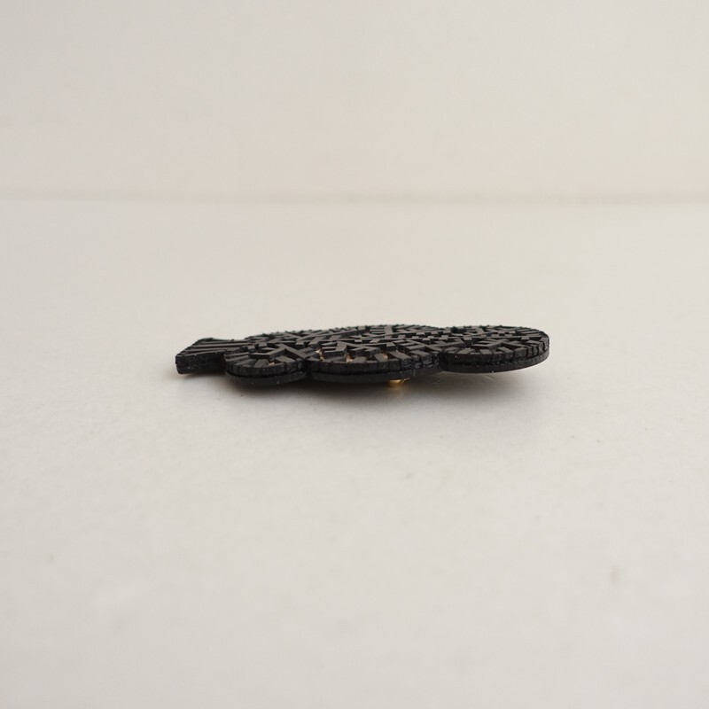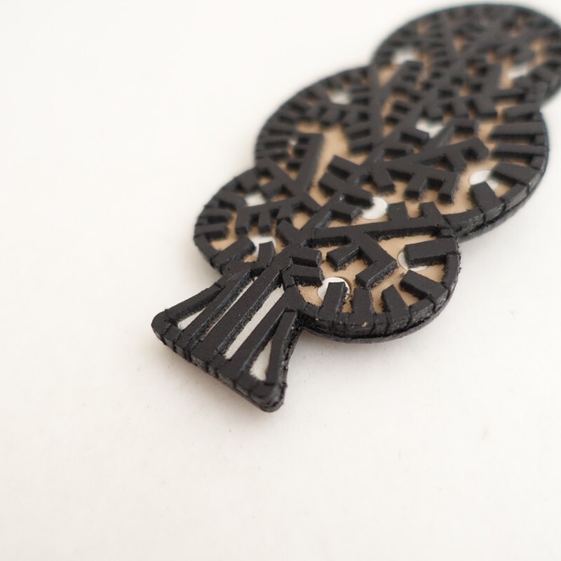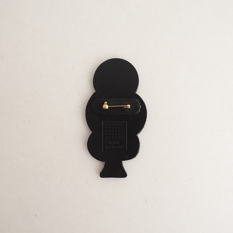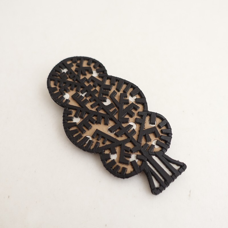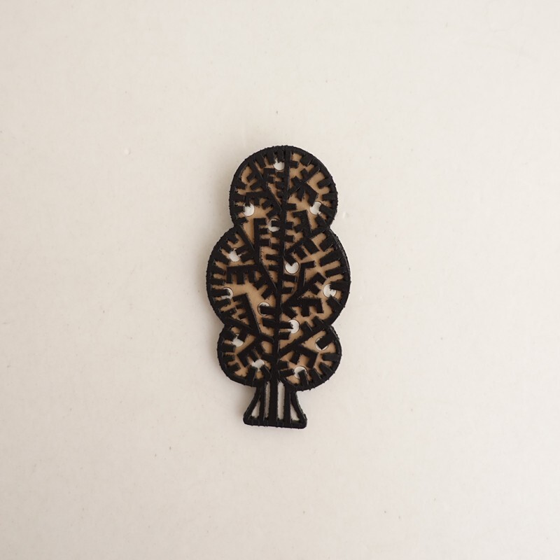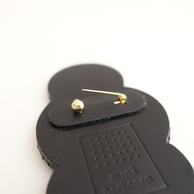 | mina perhonenのfruitree ブローチ レザーです。ベージュベースにブラックで、「fruitree」のテキスタイルが施されております。レザーによる細かな表現が美しいブローチです。定価(メーカー希望小売価格)27,500円のお品物です。 |