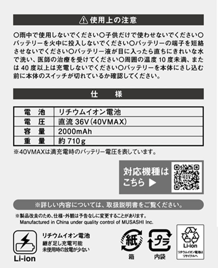 | 充電式ブロワバキューム専用 バッテリー 単品 BV-9400専用 替バッテリー 交換用 40V 2000mAh 充電パック 充電式ブロワバキューム専用 バッテリー 単品 替えバッテリー 替バッテリー 園芸用 パーツ オプション |