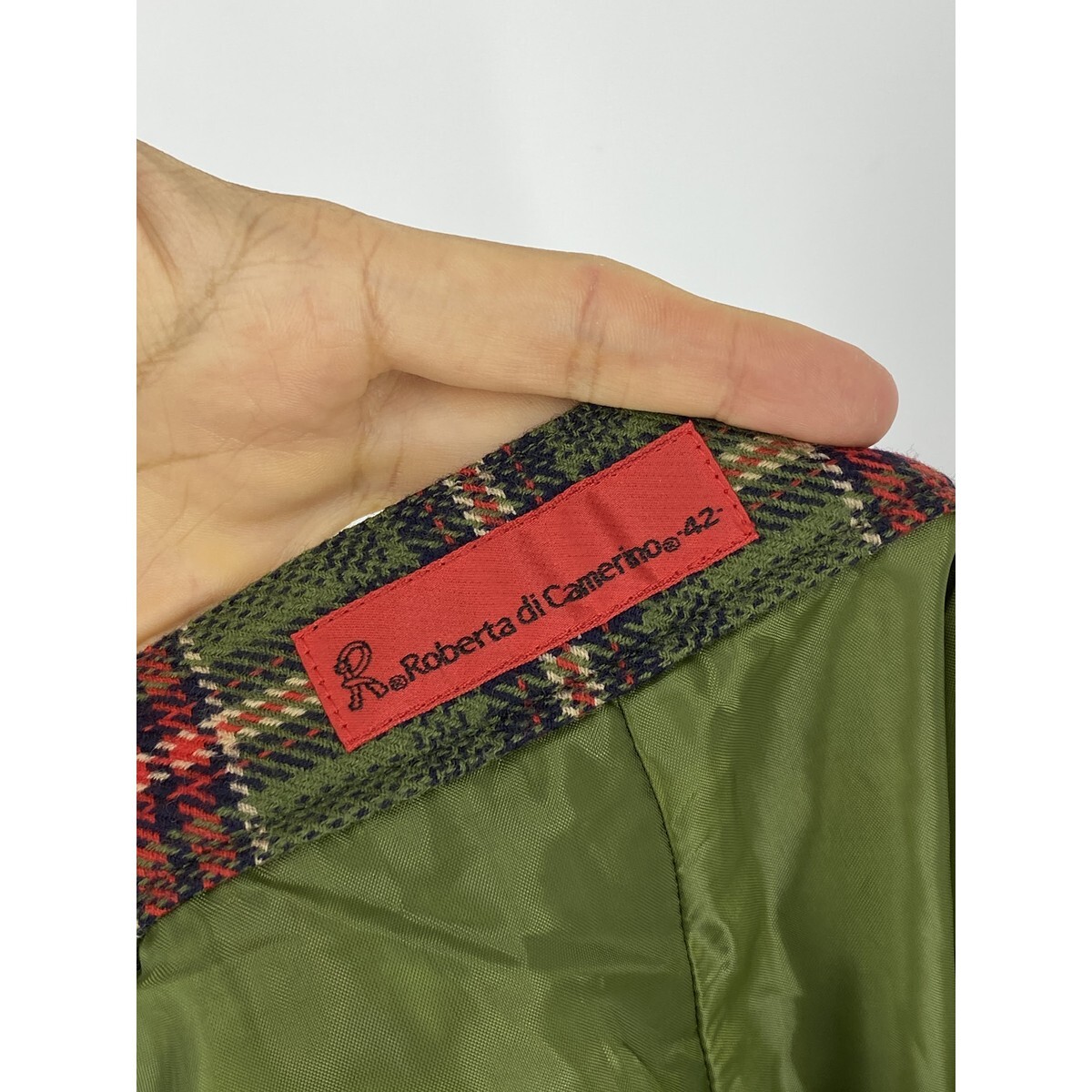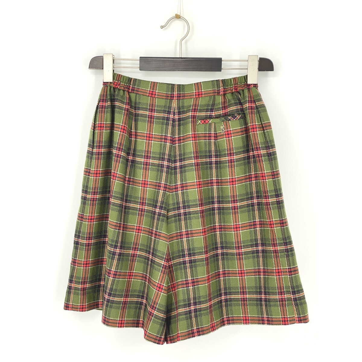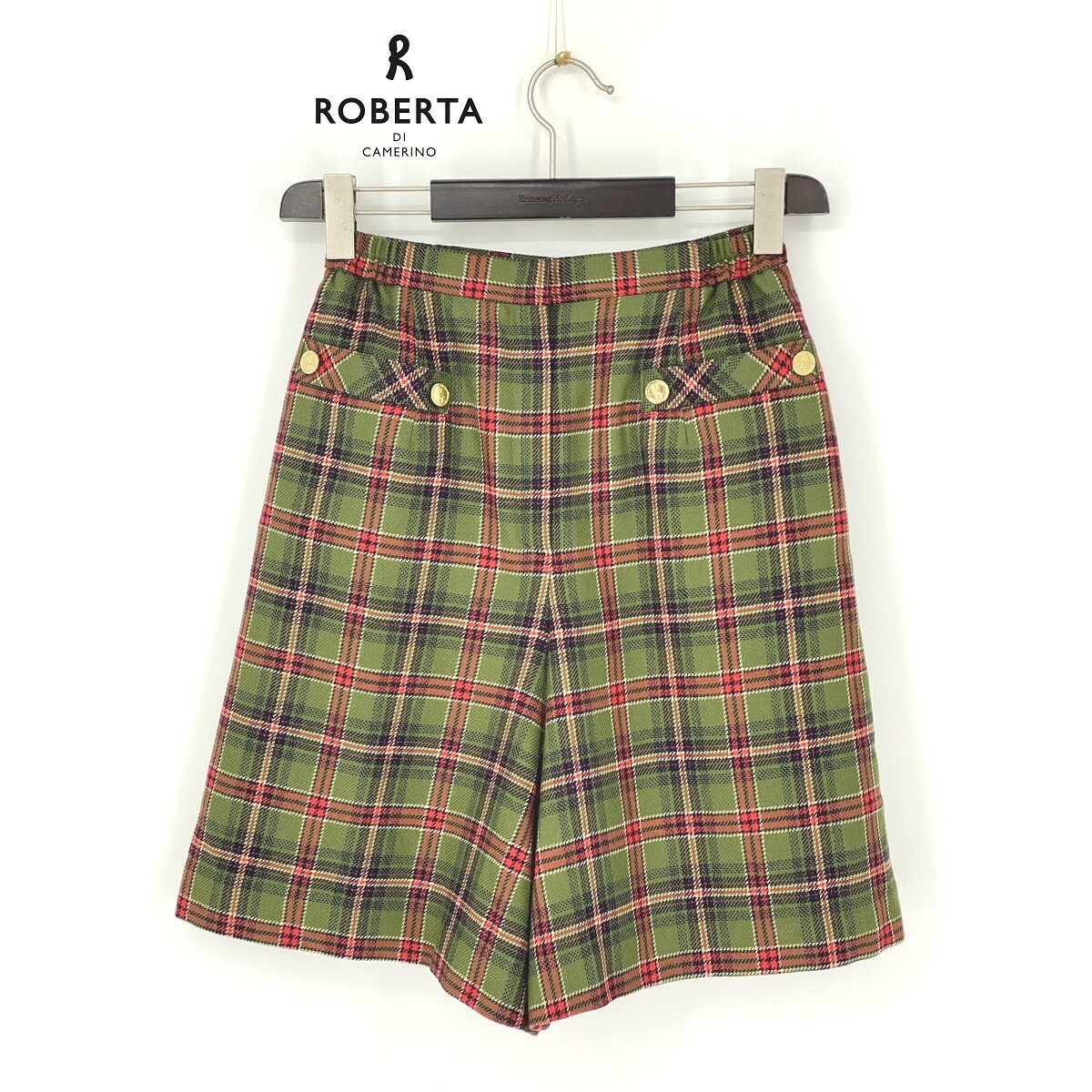 B0191/極美品 ROBERTA DI CAMERINO カメリーノ ウール チェック 金ボタン ロゴ刺繍 ウエストゴム ハーフ ワイドパンツ 42 XL 緑 レディース