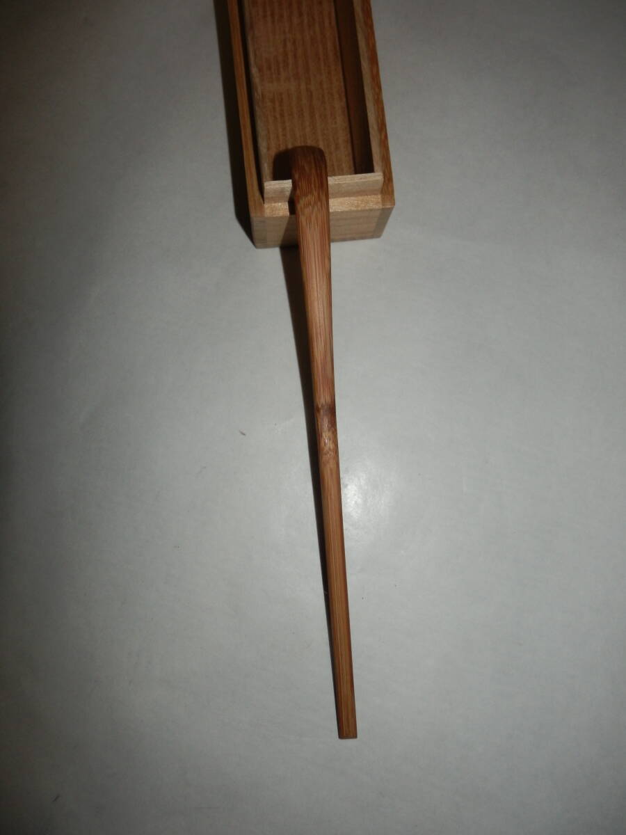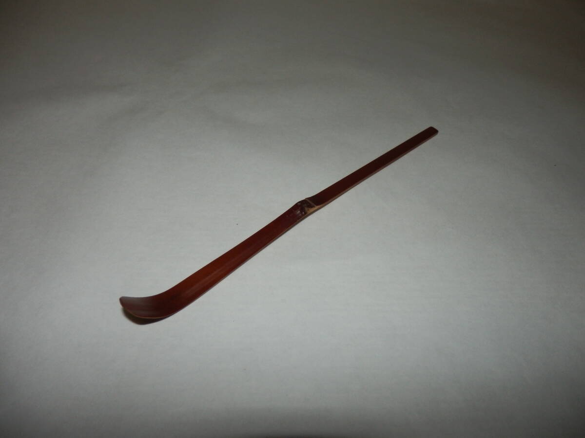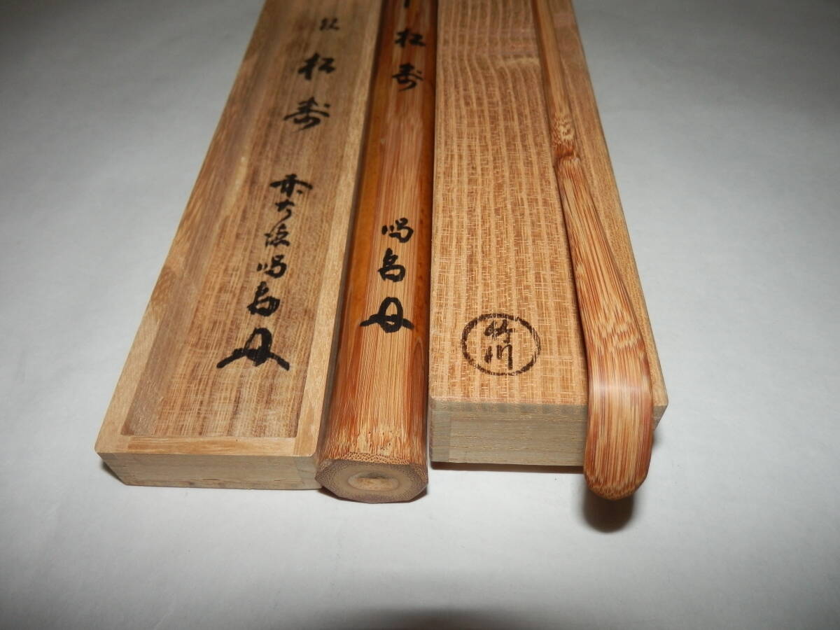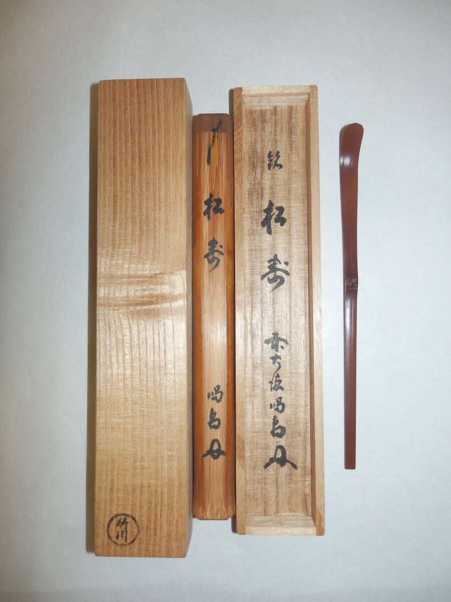 「中古品・茶道具」大徳寺の龍源院の細合喝堂さんの煤竹の茶杓です。銘「松寿」です。 竹器師の竹川さんの作です。茶杓長さ約18.6cm 竹筒・桐共箱「ヤケ、シミ等有」。 どうぞ宜しく。