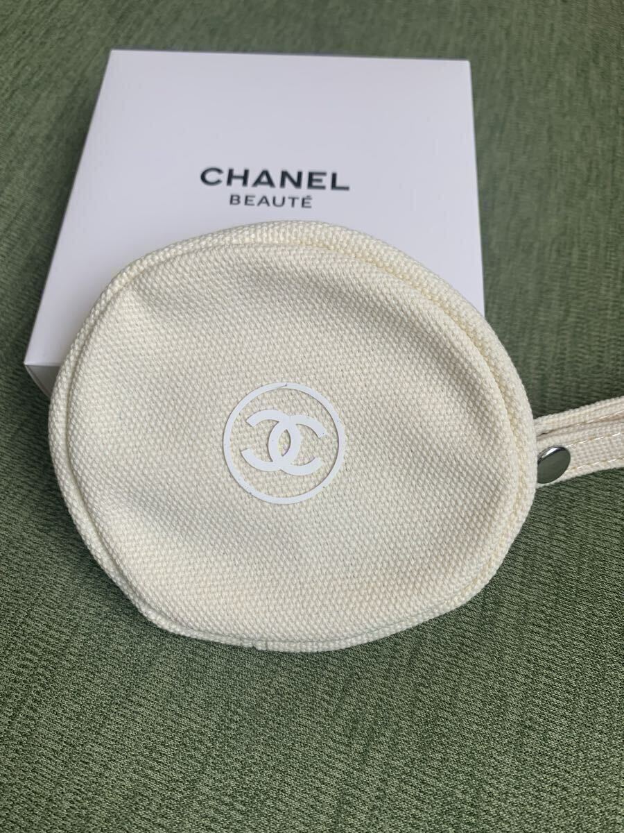 CHANELのブラックナイロン製コインケース、円形デザインで持ち運びに便利。