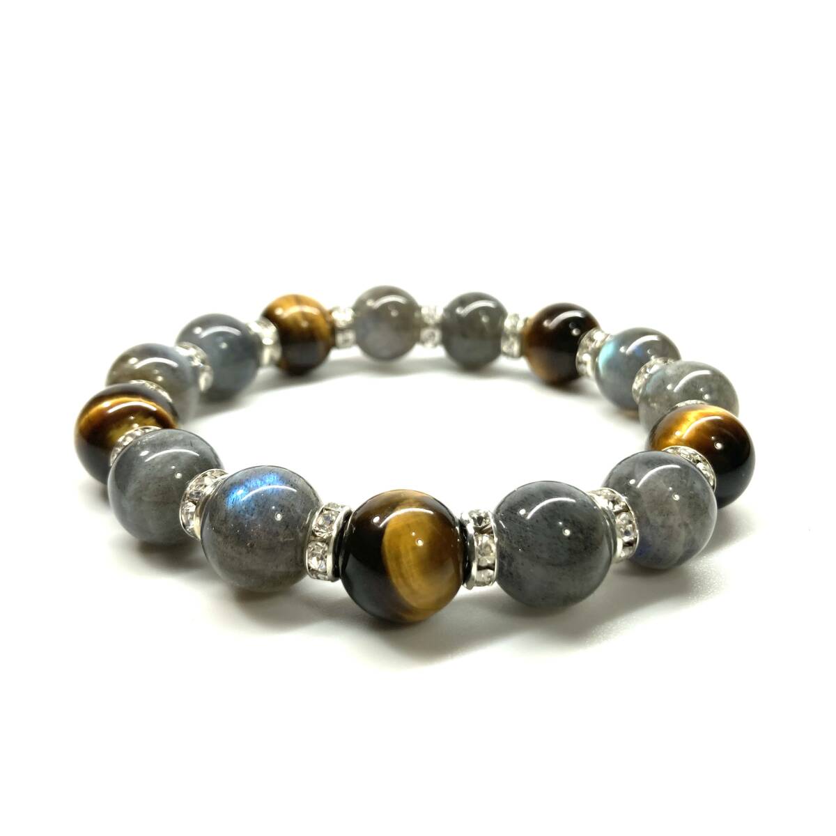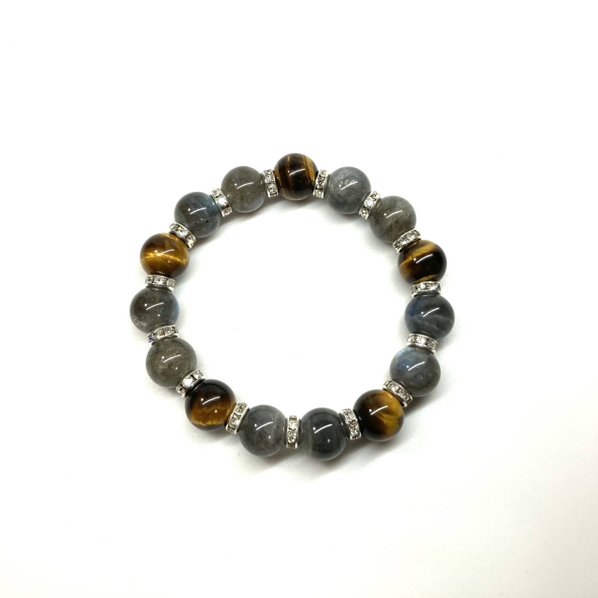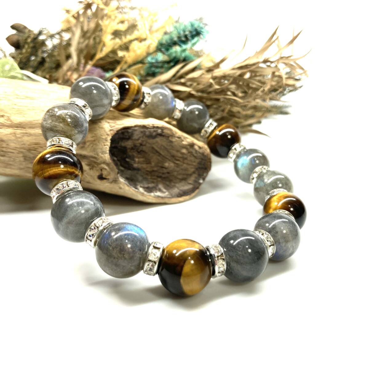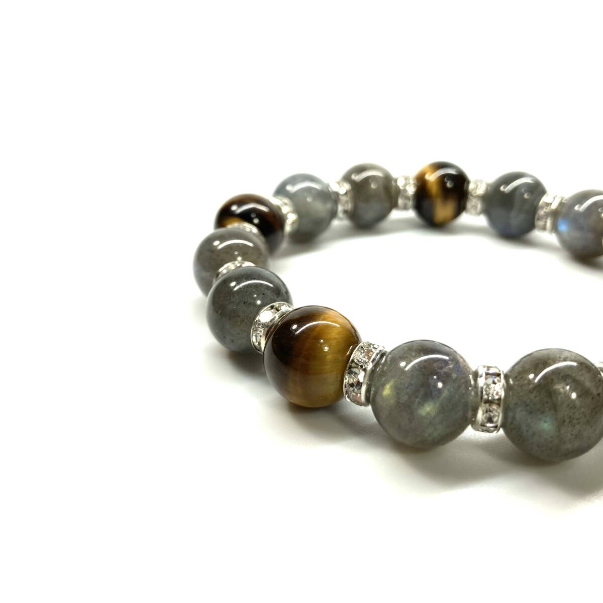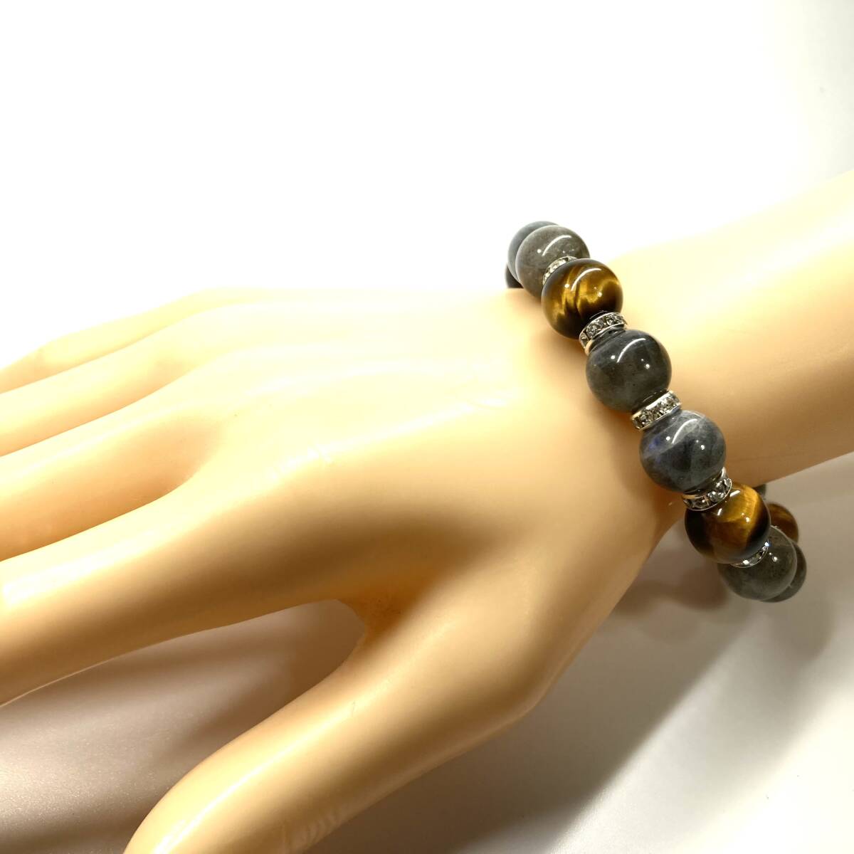 こちらは、タイガーアイとラブラドライトを組み合わせたパワーストーンブレスレットです。間にはロンデルを挟み高級感あるデザインに仕上げております。石大きさは12mm玉を使用して内周約18cmです。気になる方は是非この機会にどうぞ。