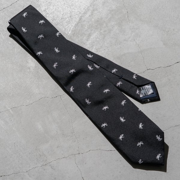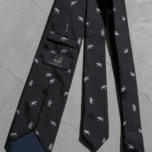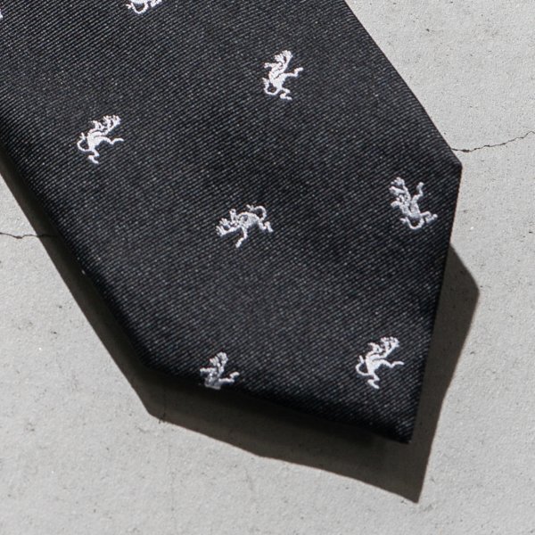 このネクタイには、アイコニックなトゥイニーデビルが施されています。これは、ダンヒルが設立された初期からのシグネチャーです。黒いシルクで作られ、ジャカード織りのADサイファーモチーフが施されています。