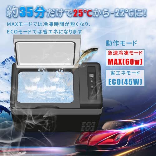【省エネしながらしっかり冷やす】①二種冷却モードが搭載され、Maxモードでは温度下がりが速く、Ecoモードでは消費電力が低いです。定格消費電力はMaxモードでは約60W、Ecoモードでは約45Wで、一日連続動作しても電力消費量が1kWh未満です。②冷蔵庫が稼働中は、コンプレッサーから1メートルのところではただ40dBほどのノイズが聞こえます。コンプレッサーの運転が停止すると、ほとんど騒音がなくて、車中泊時の夜間で安眠できます。