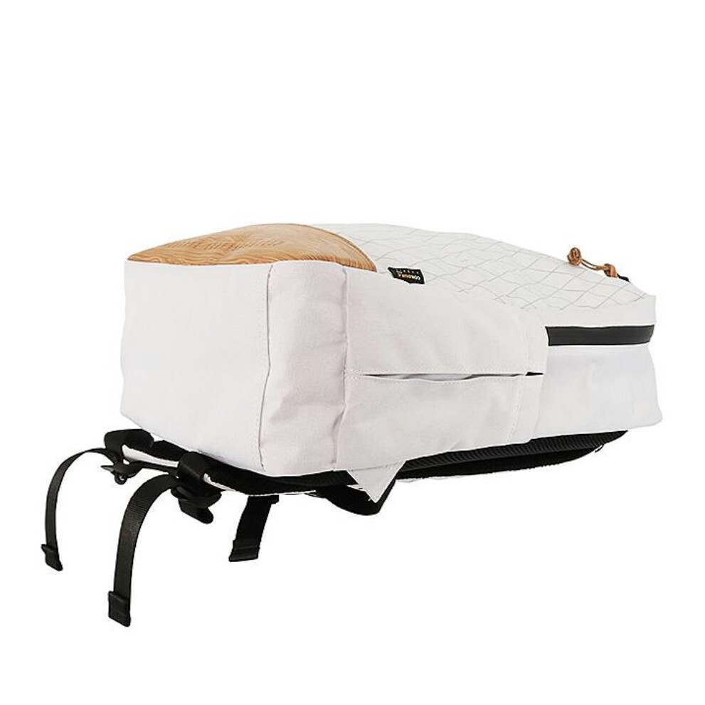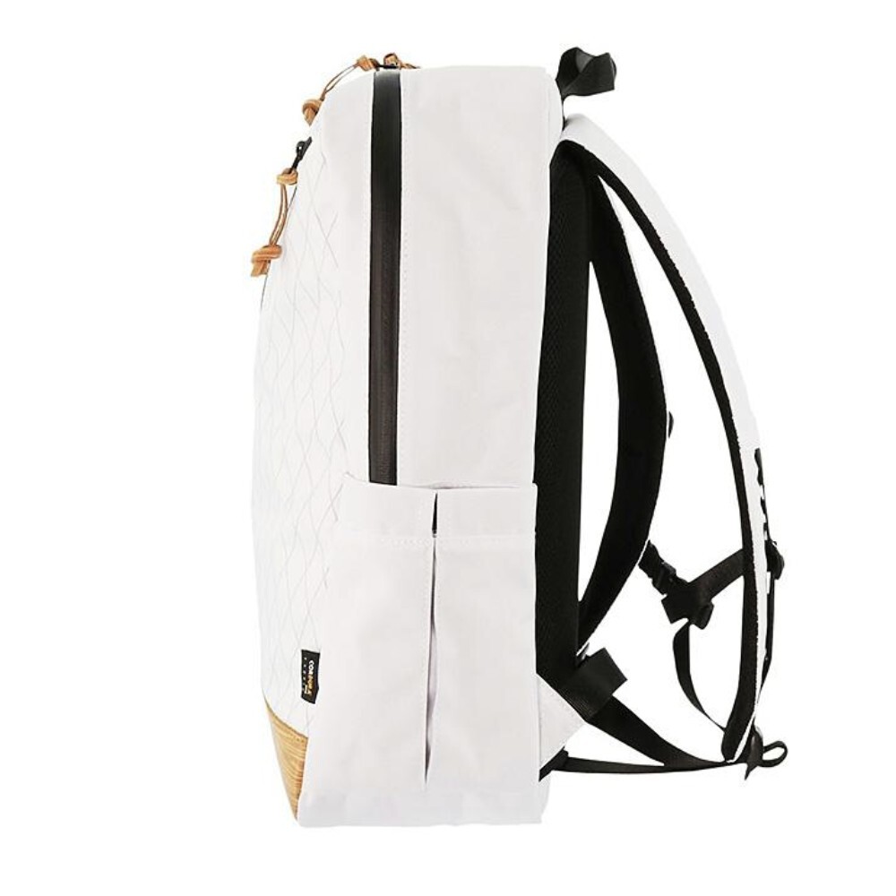 撥水性と軽さが魅力のハイテク素材を使用したリュックで、木目のレザーはブランドシンボルである木製自転車のフレームをイメージしています。