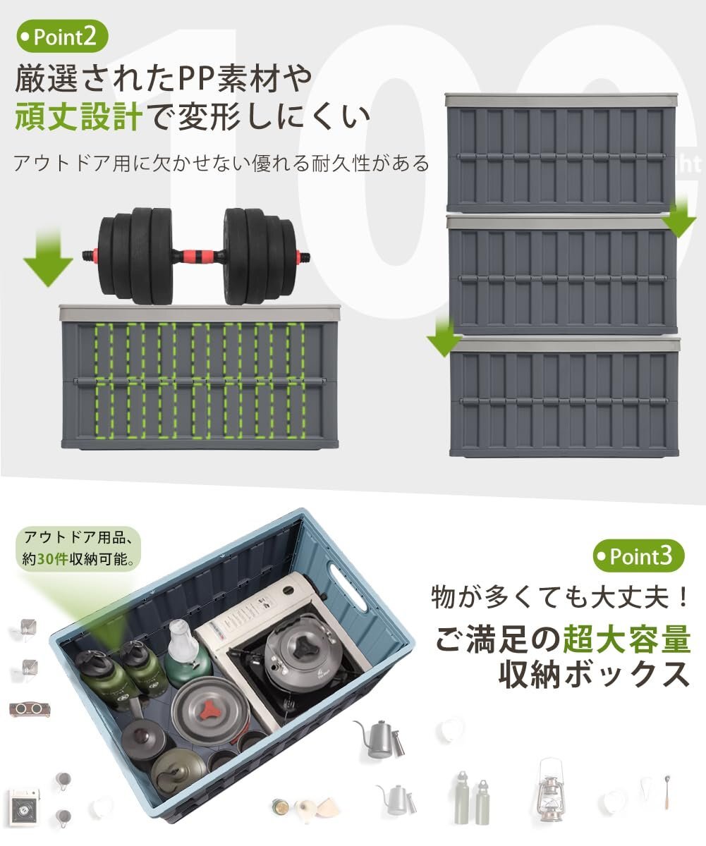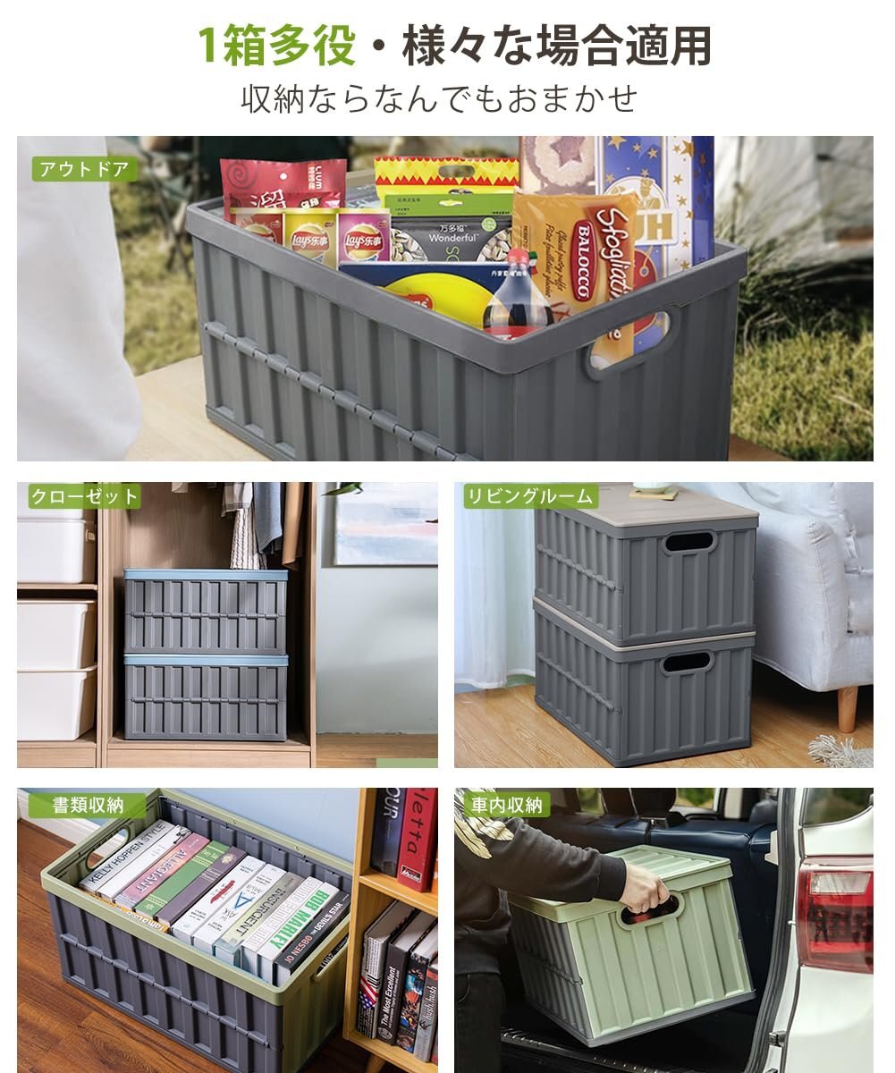 【折りたたんで収納】使わないときは折りたたんで、場所をとらずコンパクトに収納できる。車内や室内のちょっとした隙間に置くことができます。【蓋付き】フタ付きで積み重ねて収納が可能、密封性も高いので、防塵防水で湿気対策や防虫効果も期待できるため、クローゼットや押入れ収納できる。