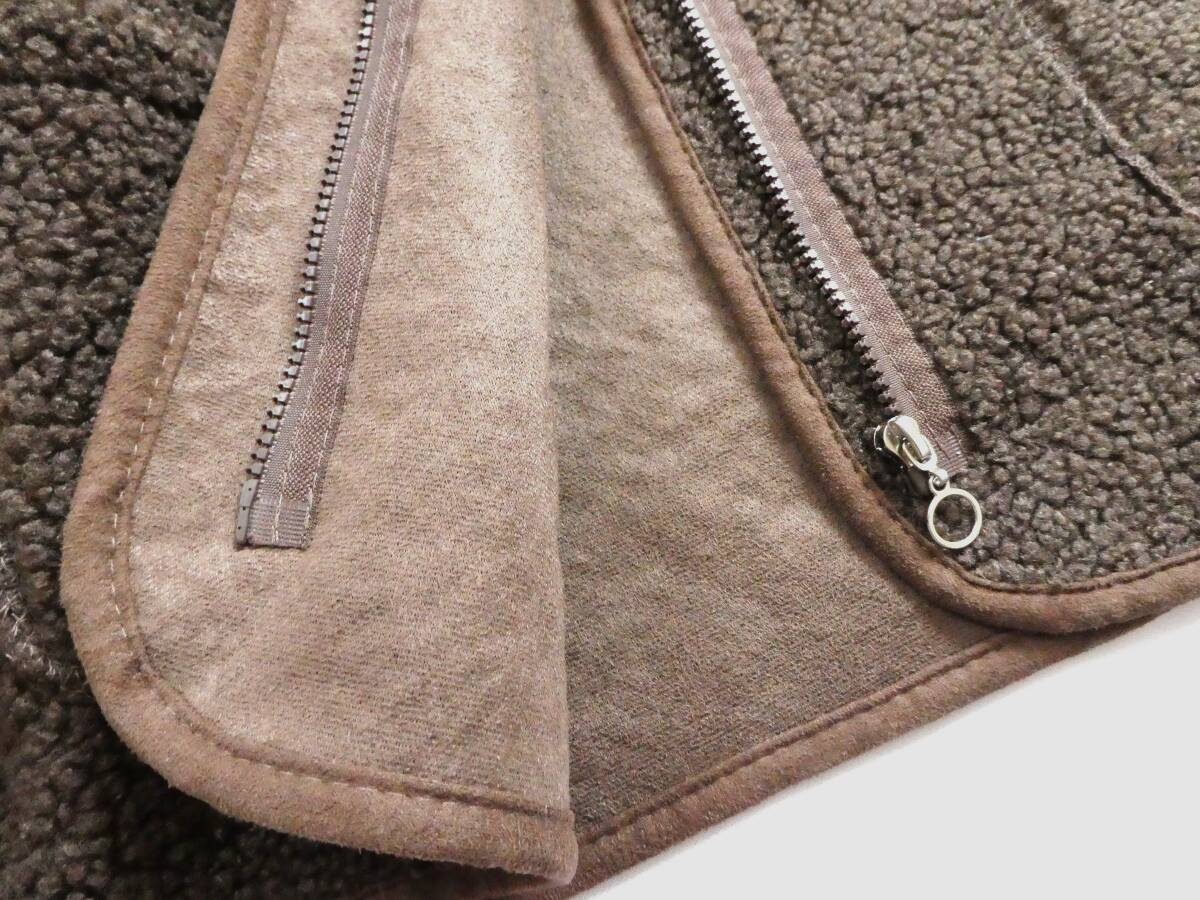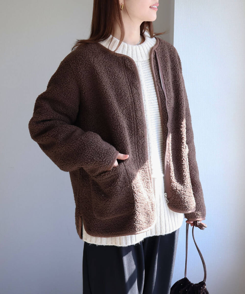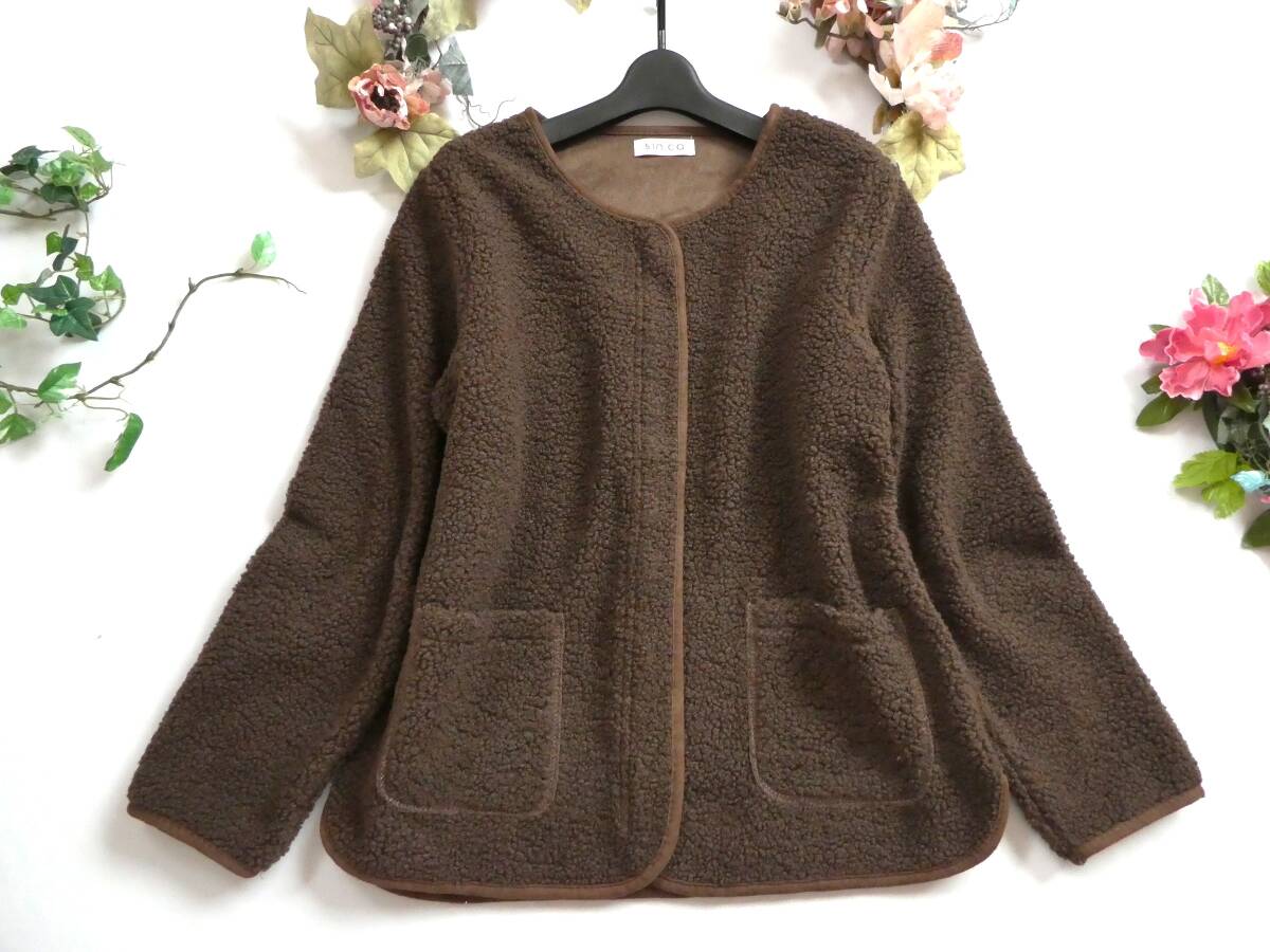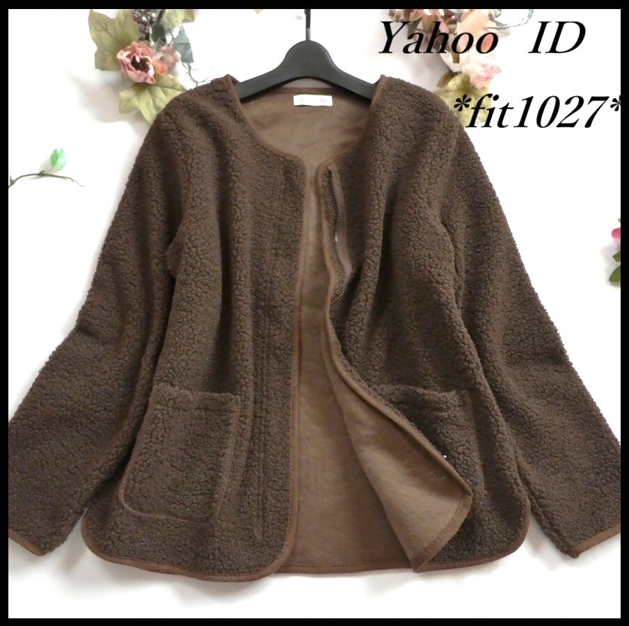 ゆったりサイズ【新品】暖かなボア素材♪ノーカラーでパイピング・ZIPの開閉★ポケットのあるジャケット・コート☆ブラウン ◆fit1027◆