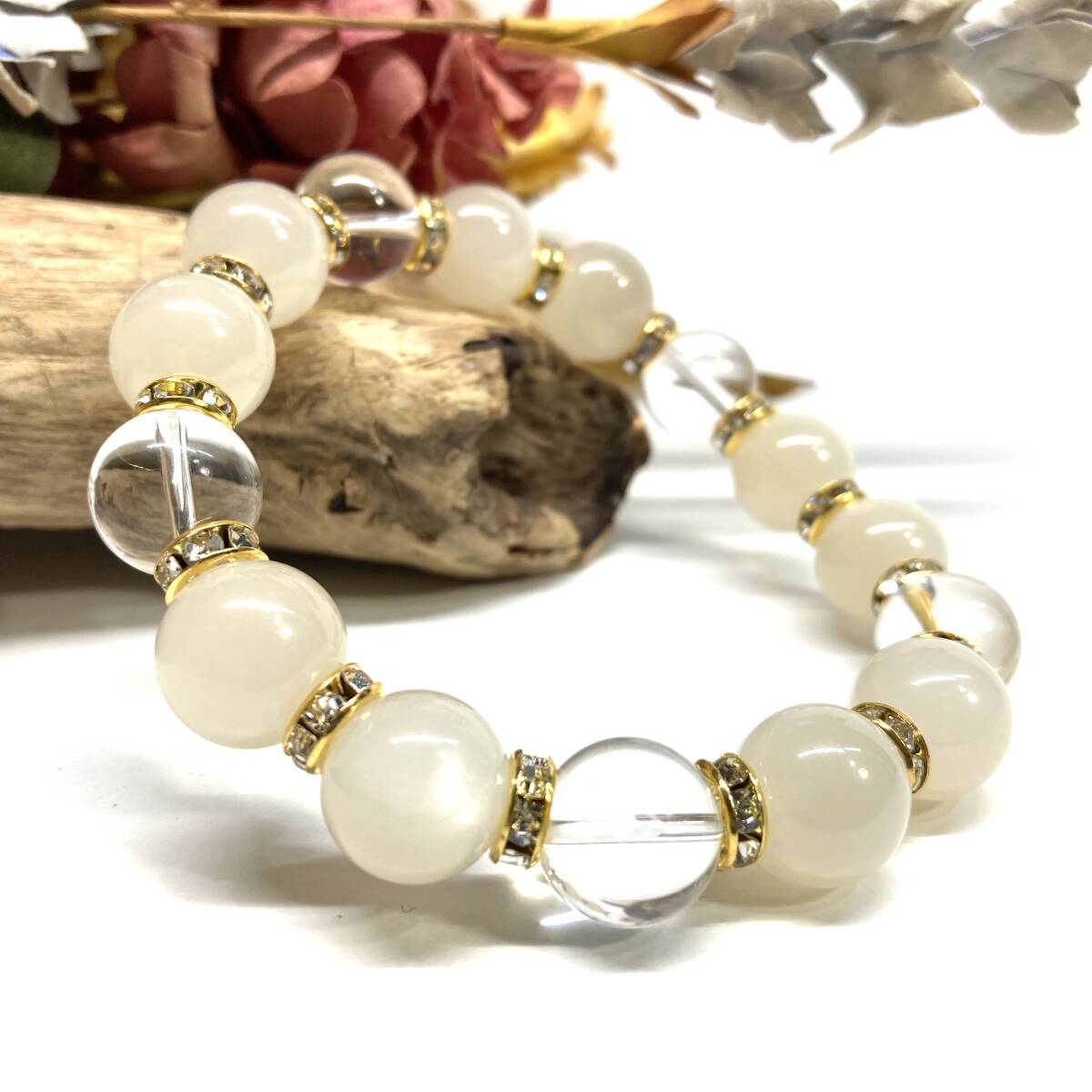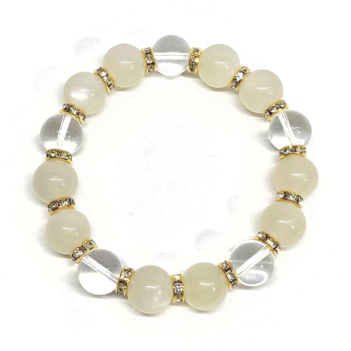 こちらは、12mm玉のムーンストーンと水晶を組み合わせたパワーストーンブレスレットです。間にはロンデルを挟み高級感あるデザインに仕上げております。石大きさは12mm玉を使用して内径約18cmです。気になる方は是非この機会にどうぞ。