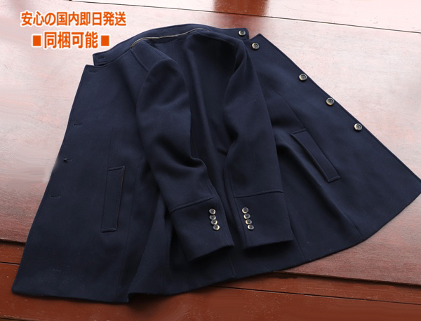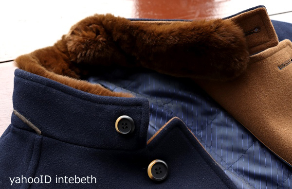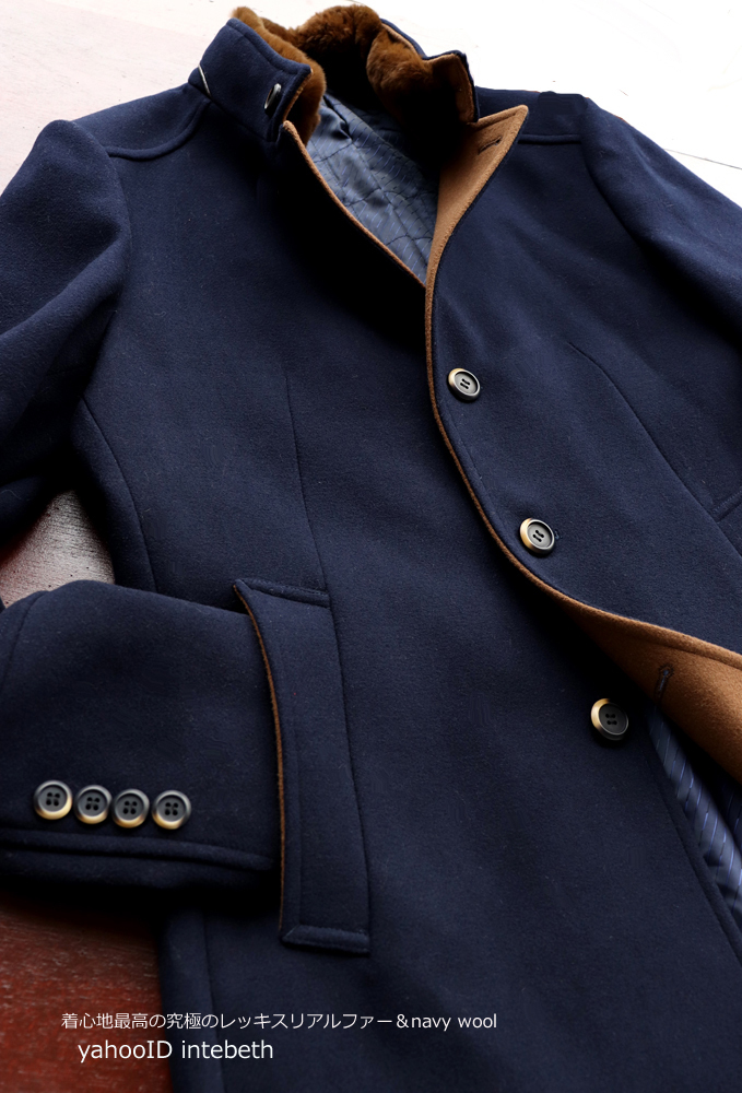 新品■G.LARINI 秋冬 紳士 リアルファー襟 ウール コート 紺茶 S◆メンズ wool ジャケット 濃紺 チェスター ネイビー スタンドカラー