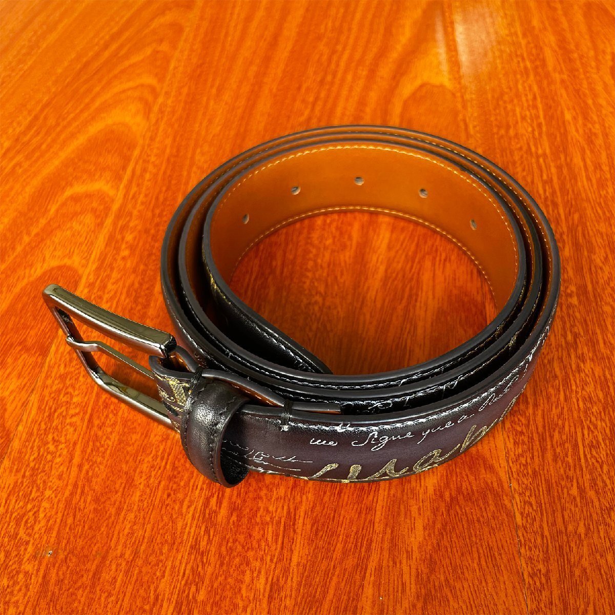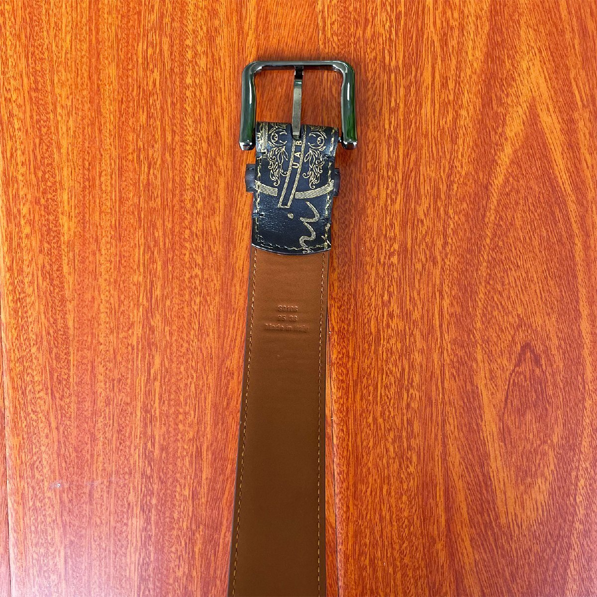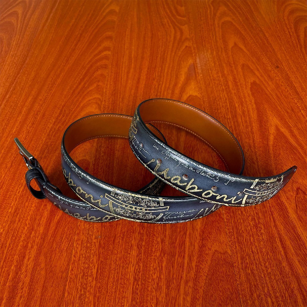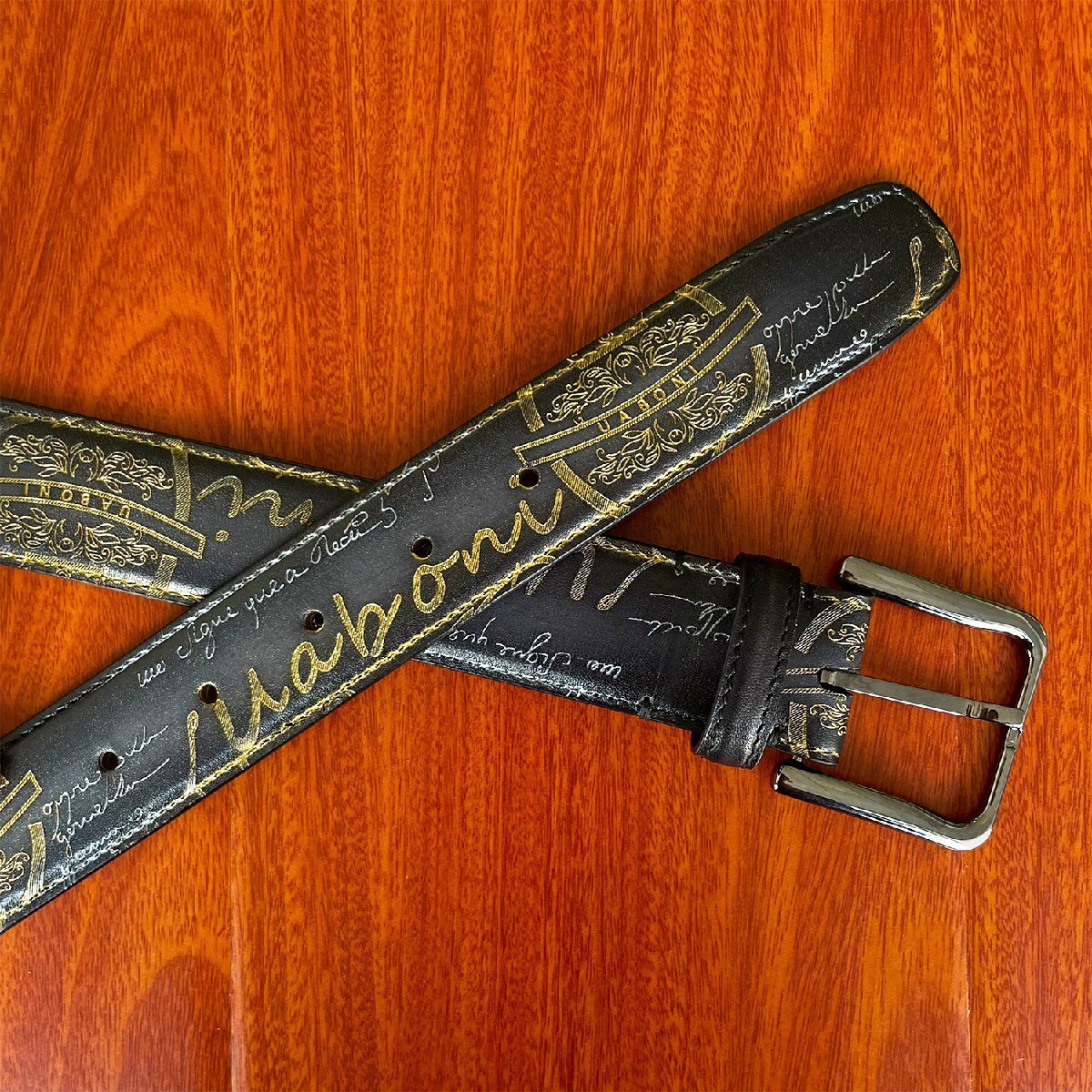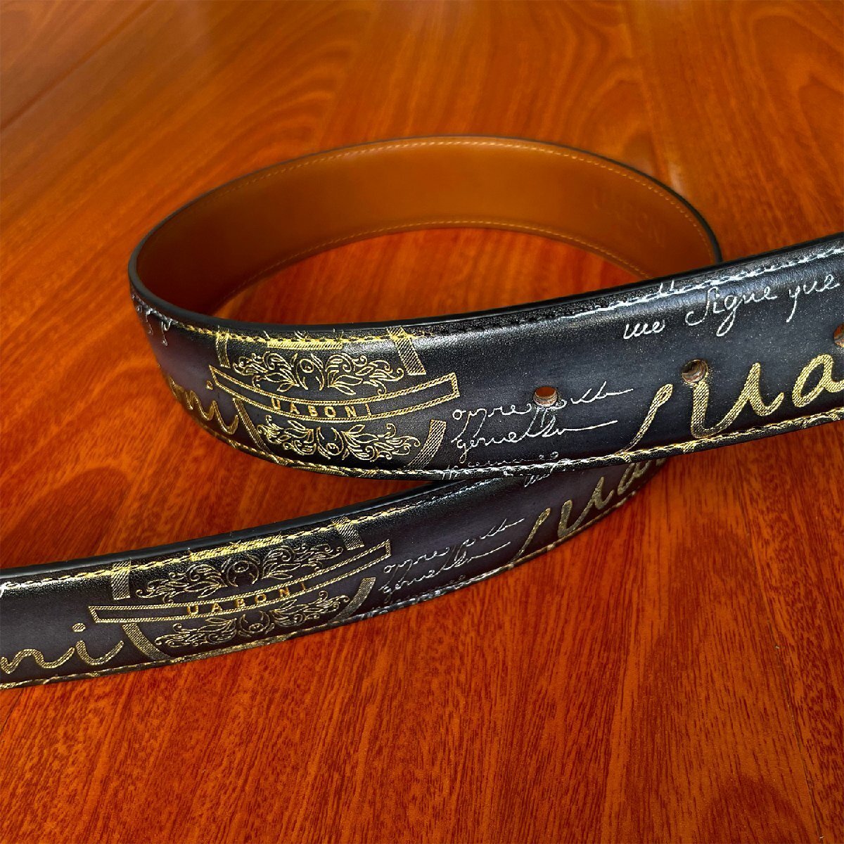 手触り感触が良くアンティーク風なベルトと仕上がりました。角の部分は丸みを帯びた設計になっており、全体的にカリグラフィーとゴールデン/シルバーパティーヌがデザインされております。色艶、柔かさに優れていて高級感溢れる逸品となります。