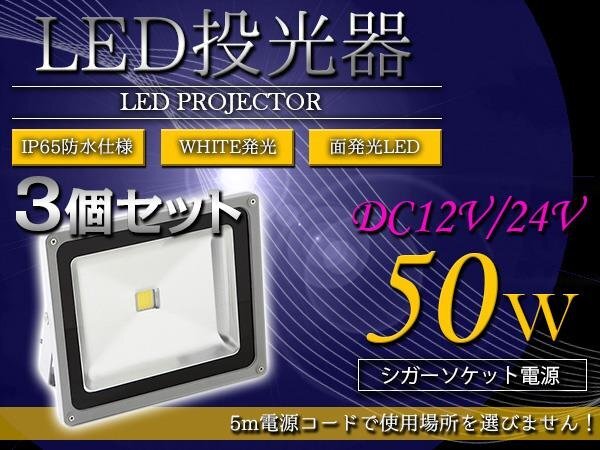 『※シガー電源 DC12V/24V』 超便利! 防水IP65 アルミ製 LED 投光器 50W 3個セット ホワイト 白発光 集魚灯 デッキライト 船