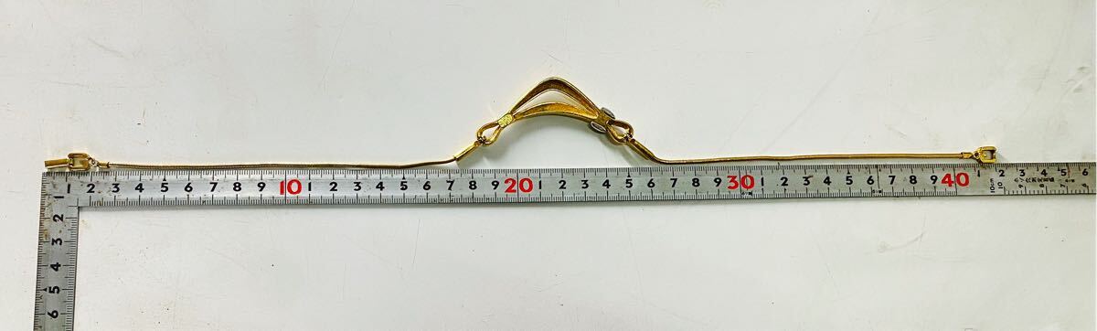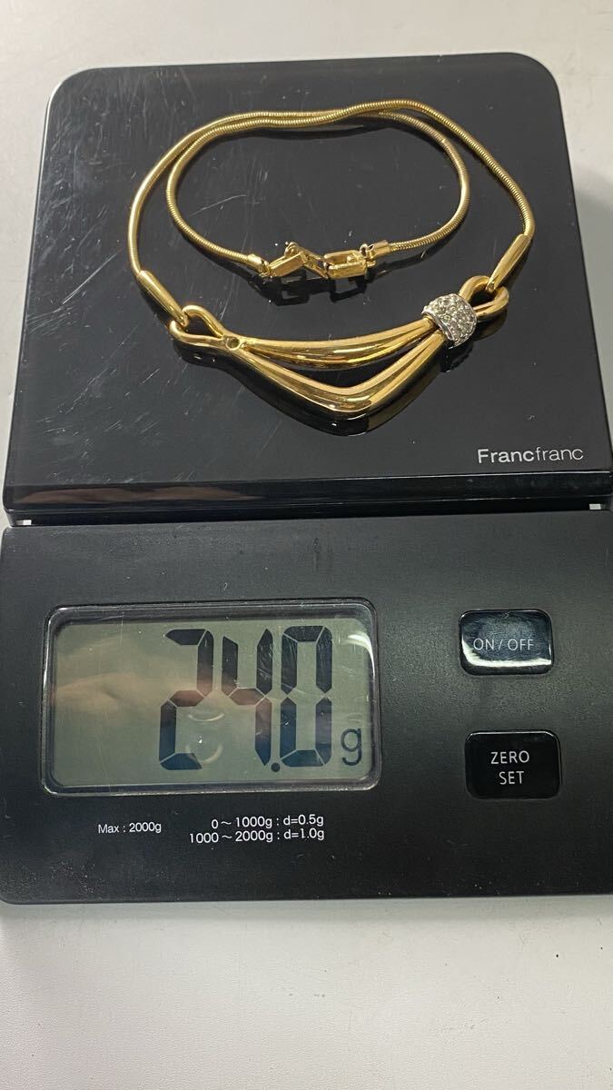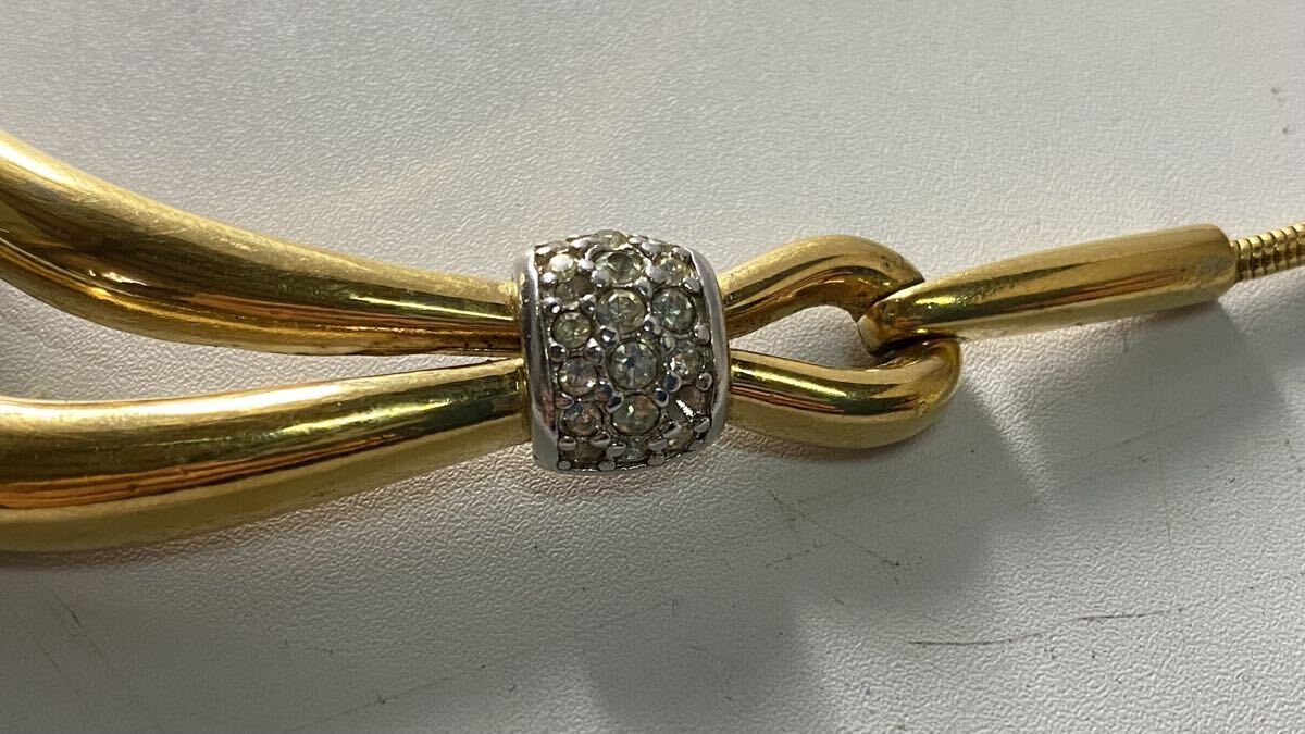- デザイン: ゴールドのスネークチェーンに、2つの曲線が交差したデザインで、クリスタル装飾が施されている