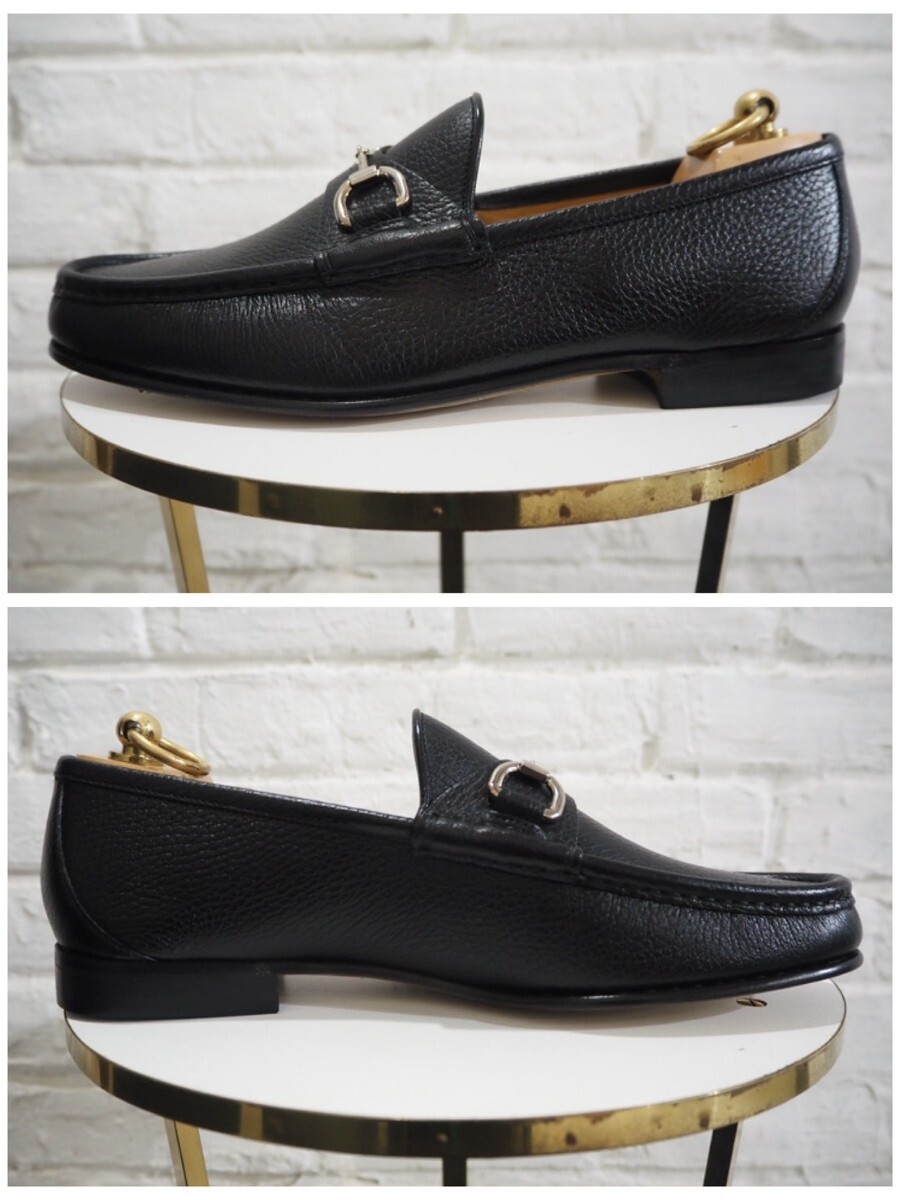 アッパーは柔らかいシュリンクレザー(牛革)、ビットはシルバー、アウトソールはシングルレザーソール、メスチャネル仕上げ。