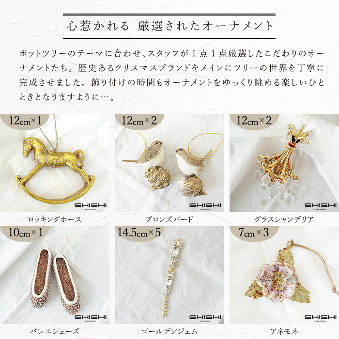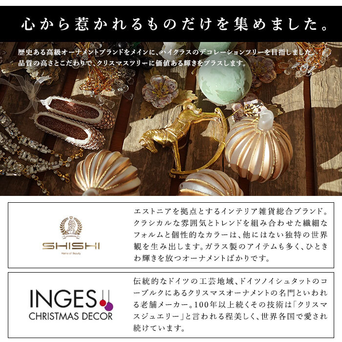 ![]() ![]() ![]() クリスマスオーナメントセット 27set GOOD OLD DAYS グッドオールドデイズ (ツリー別売り) わたしに優しく寄り添うメモリーツリー 楽しかったことや 嬉しかったことは、 いつになっても忘れない。 あの時、あの瞬間の 幸せな気持ちを 形に残した わたしの大切な 思い出のアルバム。 世界を代表するオーナメントブランドから厳選した、最高級のオーナメント。 【INGE-GLAS MAGIC】 【SHISHI】 歴史ある高級オーナメントブランドをメインに、一からデザインしたオリジナルアイテムを交えハイクラスのデコレーションツリーを目指しました。 品質の高さとこだわりで、クリスマスツリーに価値ある輝きをプラスします。 心惹かれる厳選されたオーナメント ポットツリーのテーマに合わせ、スタッフが1点1点厳選したこだわりのオーナメントたち。歴史あるクリスマスブランドや、弊社オリジナルのオーナメントを交えながらツリーの世界を丁寧に完成させました。飾り付けの時間もオーナメントをゆっくり眺める楽しいひとときとなりますように…。 ※掲載している商品はオーナメントセットのみの販売です。 ツリーは別売りになります。 安心の品質をお届け お客様に安心して商品をお届けしたいという思いから徹底した品質管理に取り組んでいます。 「抜かりない国内検品」 商品を出荷する前にすべての箱を開封し、必要な部品がそろっているか十分に確認してから再度梱包して出荷しています。 「徹底した品質管理」 枝や幹、枝葉の部分など、キズや破損が見当たらないかひとつひとつ手作業で目視しながらチェックしていきます。 注意書き ご開封の上、ご確認ください。 サイト上では、できる限り実際の商品に近い形でご紹介するように心がけておりますが、 モニターのパネルやブラウザーの環境により、色・サイズ・素材感などがお客様と相違が生じる場合がございます。 取扱商品には自然素材を使用した物、アンティークで仕上げを施した物もあり、 掲載写真と若干の違いが出てくる商品がございます。あらかじめご了承ください。 ご不明な点や分かりにくい点がございましたら、ご注文前に遠慮なくお問い合わせフォーム、メールにてお問い合わせください。 【オーナメントについて】 色むらや傷、塗装の乱れなどが見られる場合がございますが、不良品ではございません。海外製品の手作り商品のため、あらかじめご了承ください。(保証対象外) ハンドメイド仕上げのため、色やデザインに極微細な個体差が生じる場合がございますので、あらかじめご了承ください。(保証対象外) デザインの特性上、表面のグリッターやビーズがまれに落ちることがございます。お取り扱いにご注意ください。(保証対象外) 出荷時は商品の状態を全て検品した上で出荷しておりますが、万が一不良品や運送事故による破損・汚損、発送ミスなどがあった場合は、弊社が責任を持って対応させていただきます。 商品到着後、すみやかに弊社までご連絡ください。 商品のご返送に関する詳しいお手続き方法について、追ってご連絡差し上げます クリスマスオーナメント,オーナメントセット,ツリーオーナメント,ミニツリー,卓上ツリー,ミニクリスマスツリー,卓上クリスマスツリー,テーブルツリー,ミニツリーセット,クリスマスツリーセット,セカンドツリー,イルミ,イルミネーション,電飾,LEDライト,もみの木,もみ,ドイツトウヒ,限定数,新作,クリスマスイルミネーション,クリスマス雑貨,デコレーション,クリスマス,christmas,christmastree,ガラス製,プラ,ハンドメイド,ノスタルジック,レトロ,ヴィンテージ,アンティーク,サンタクロース,スノーマン,星,スター,ツリー,ボール,ボールオーナメント,ボールオーナメントセット,クリスマスリース,ゴールド,金,シルバー,銀,クラシック,正規品,正規輸入品,本物,おしゃれ,北欧,スノーフレーク,雪の結晶,リボン,ツリートップ,INGE-GLAS,インゲグラス,SHISHI,シシ,