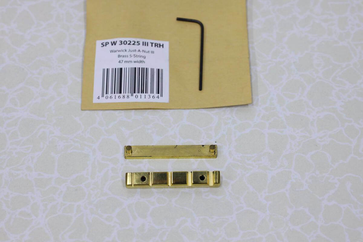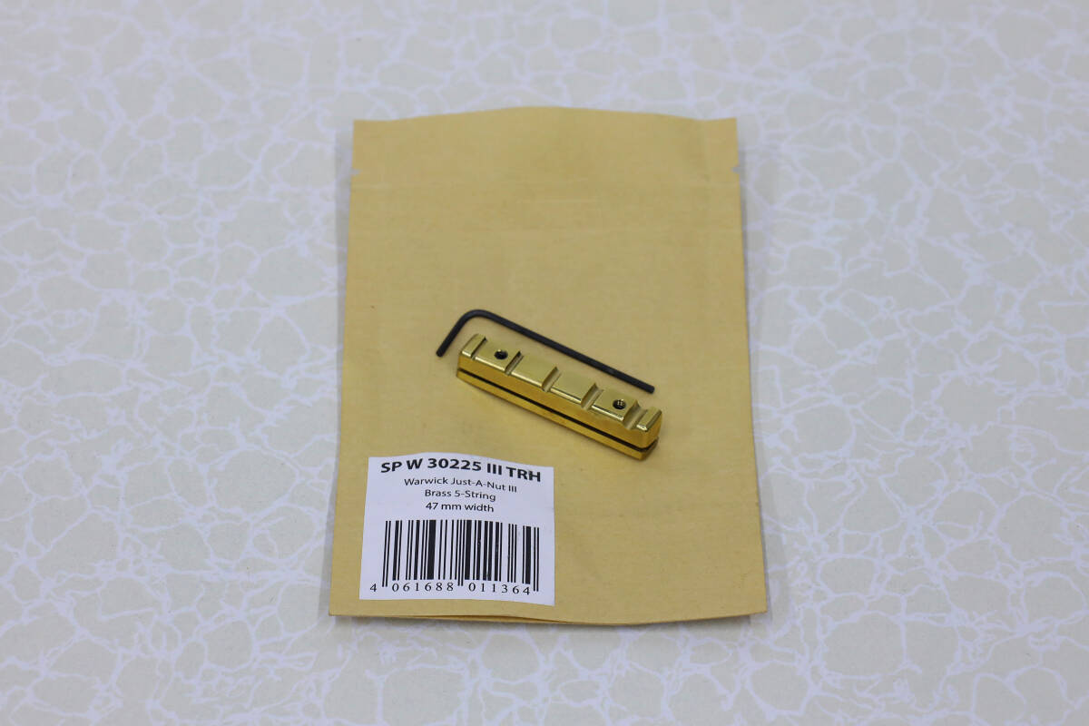 出品物は Warwick製 Just-A-Nut(真鍮製) です。 5弦Warwickベース「ブロードネック」(ナット幅47mm)対応モデルで、公式パーツ番号は SPW30225IIITRH です。